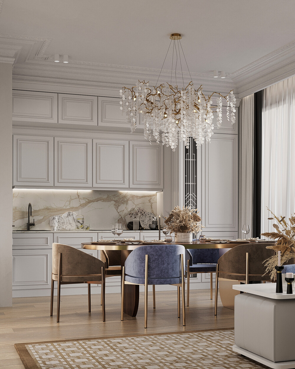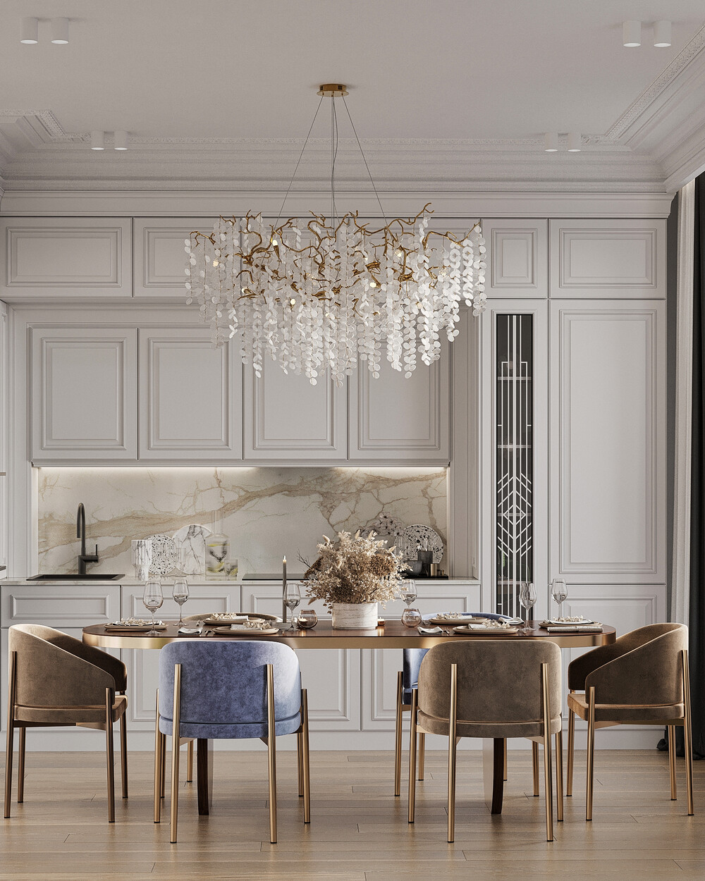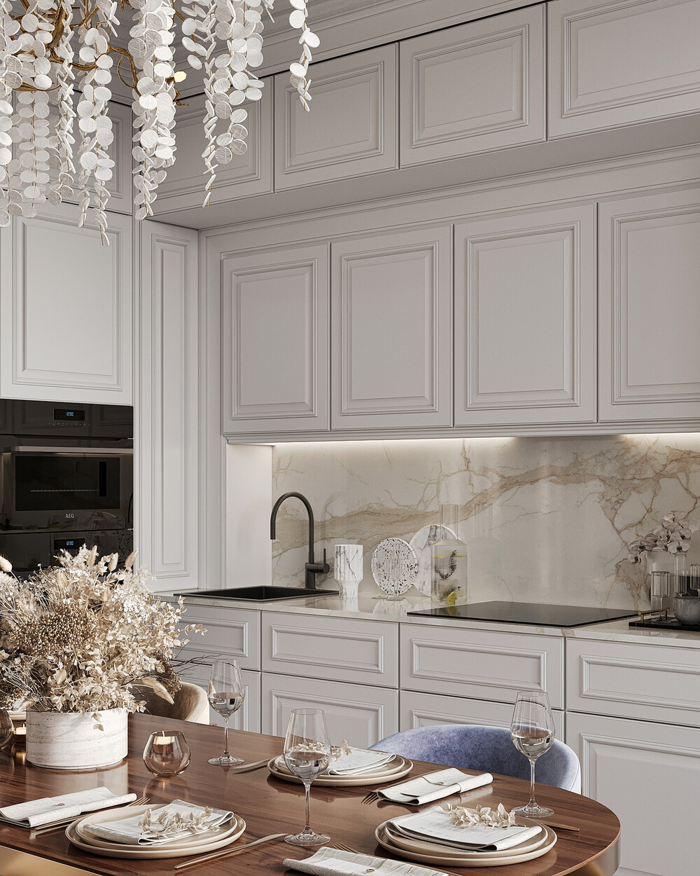 Кухонную зону оформили в стиле светлой неоклассики с графичными линиями и встроенной техникой. Мы решили не ставить кухонный остров, чтобы освободить место для большого обеденного стола.