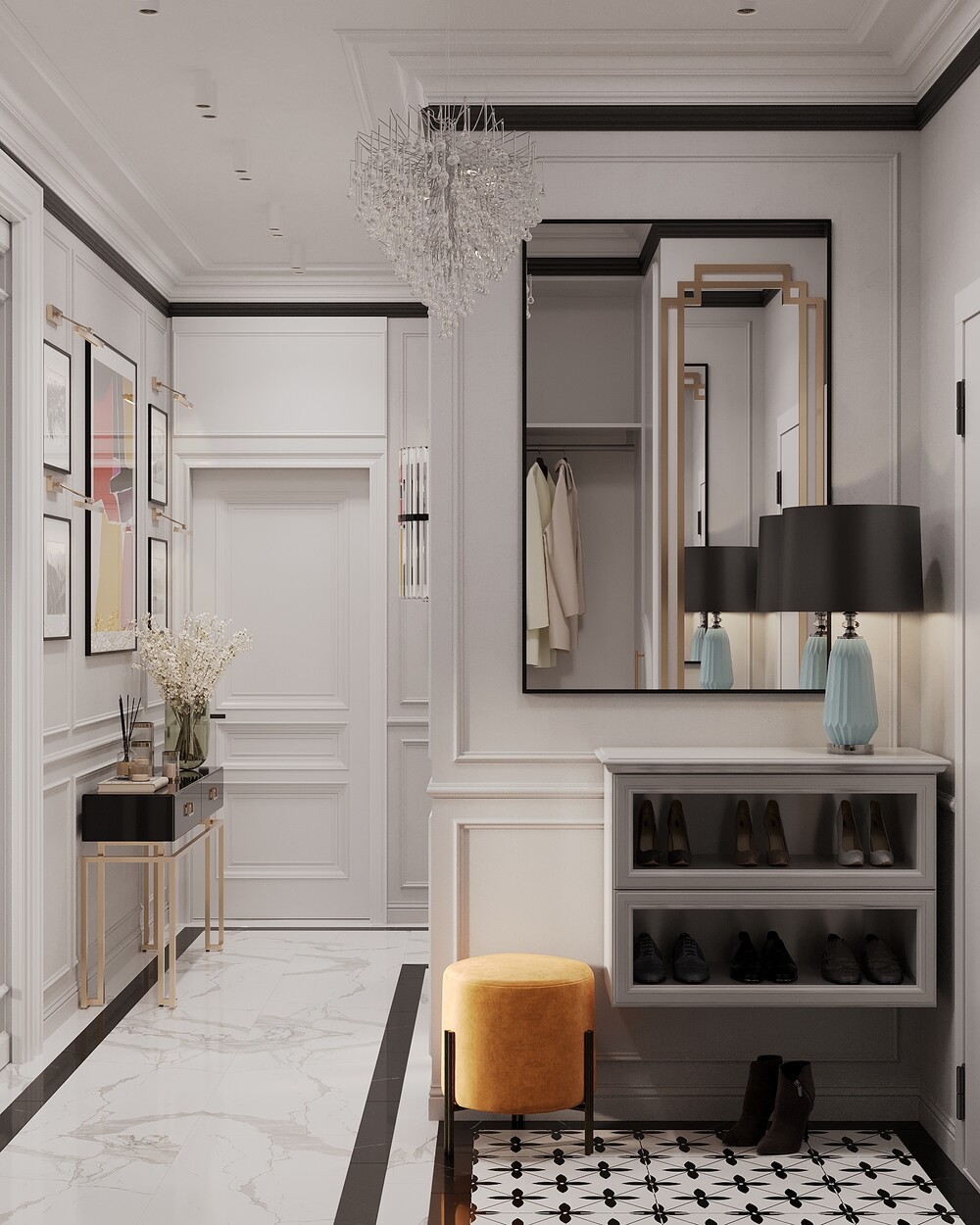 Прихожую выдержали в светлых тонах, добавив черные графичные акценты и классические молдинги. Большое зеркало зрительно увеличивает холл и добавляет пространства.