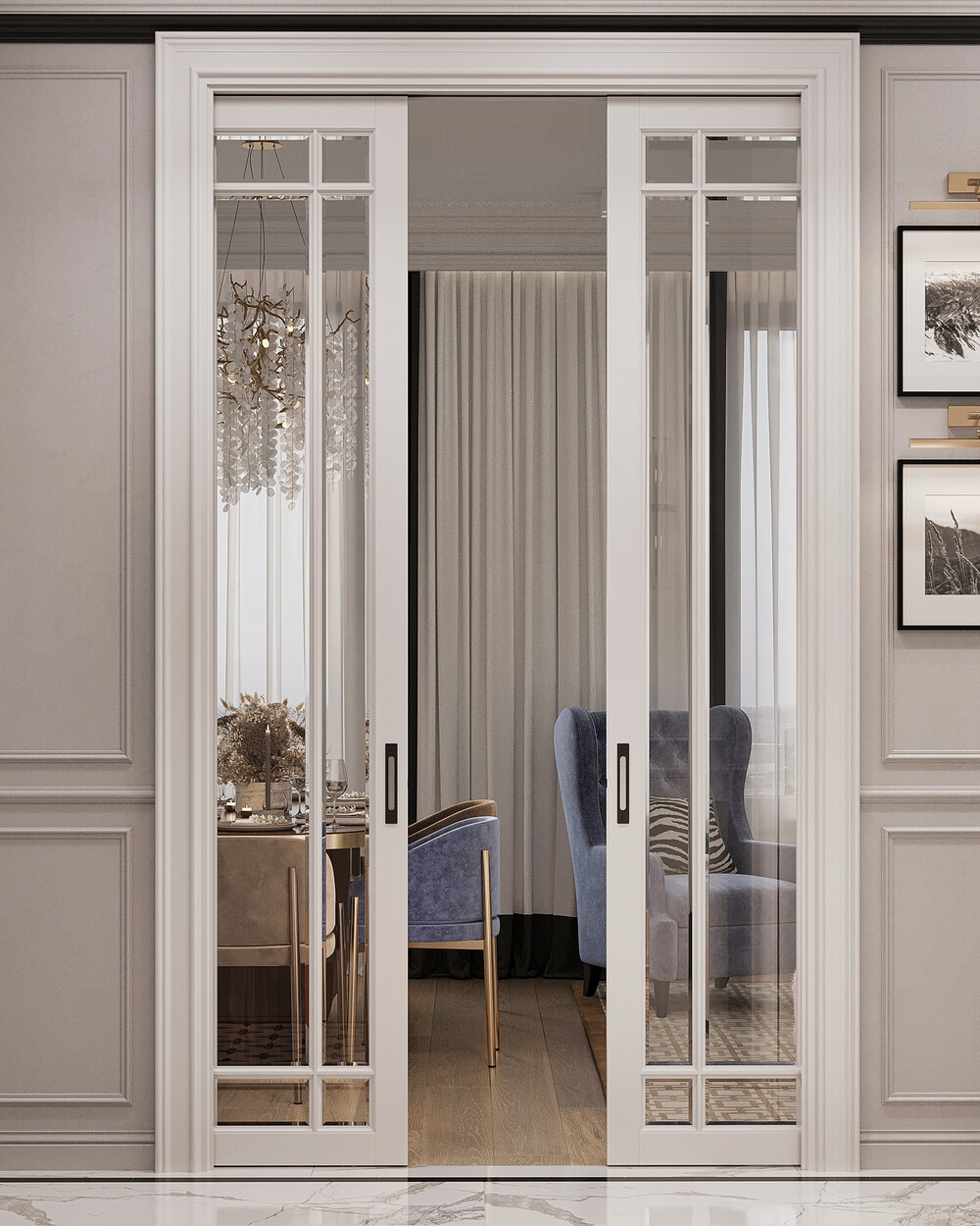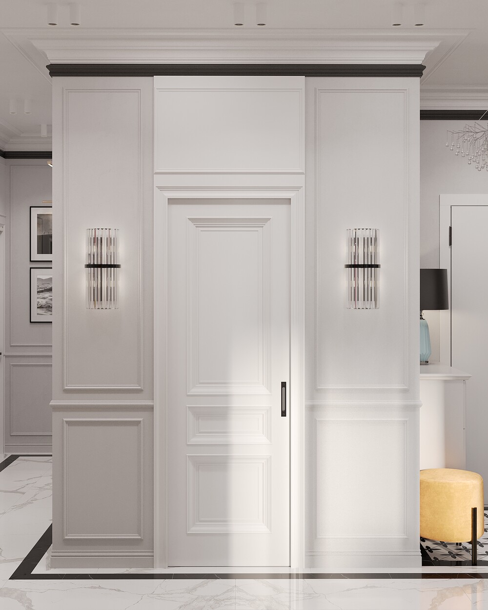 Краска и молдинги — формируют нейтральный фон и подчеркивают классическую основу интерьера.
