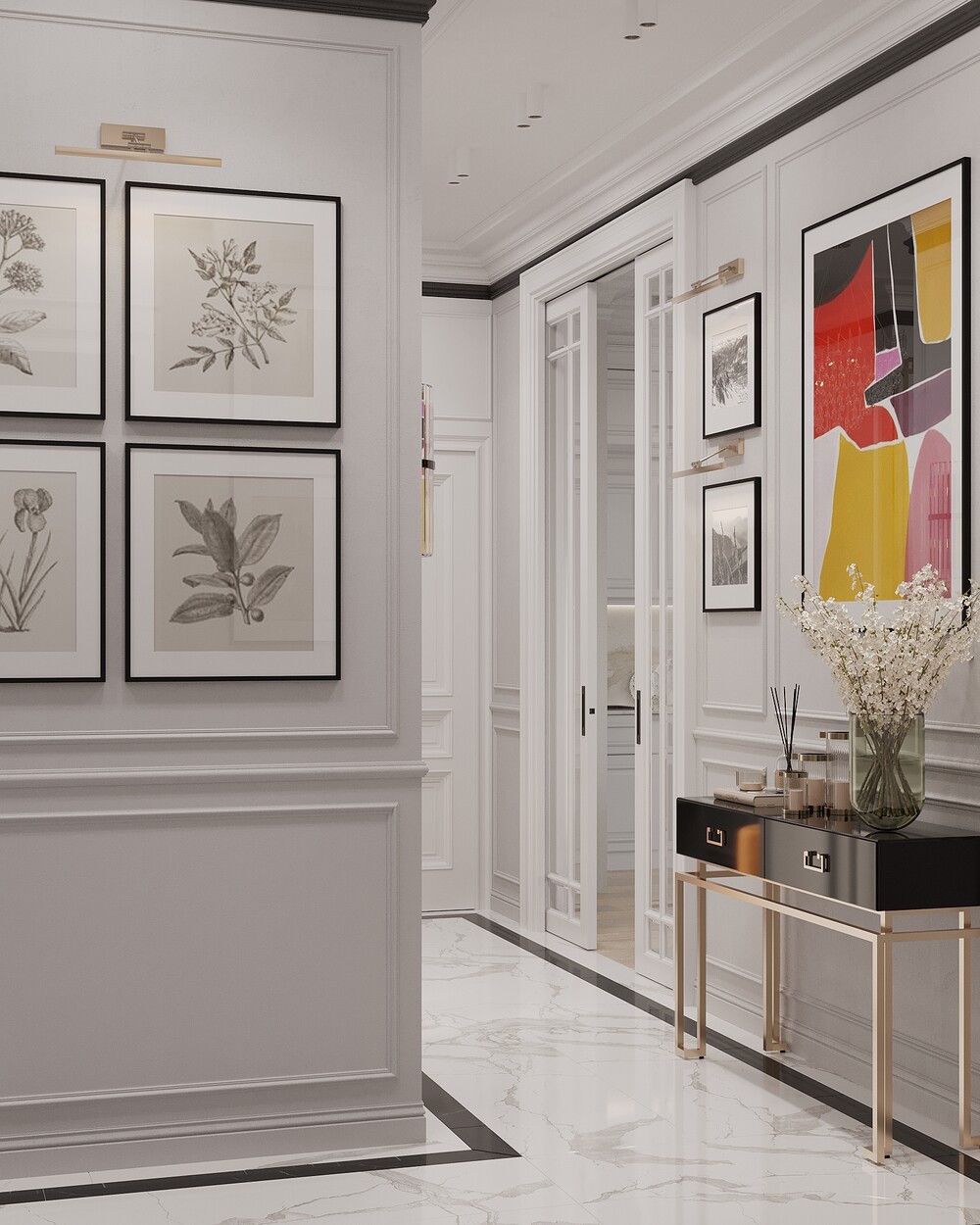 Основное хранение вынесли в отдельную гардеробную, поэтому при входе нет загромождения мебелью. Детали из латуни и лаконичная консоль с предметами искусства завершают входную группу.