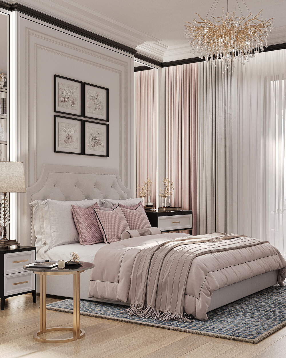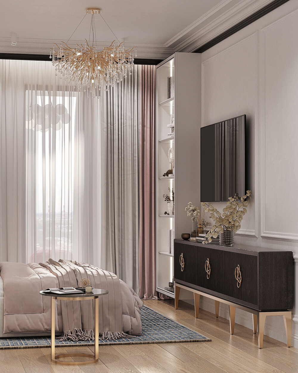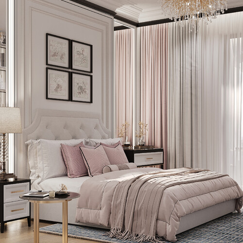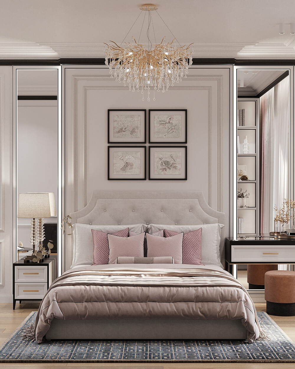 В спальне использовали светлую палитру и сделали ставку на тактильные поверхности. Кровать с мягким изголовьем расположена в центре, ее обрамляют классические настенные панели и симметричные светильники.