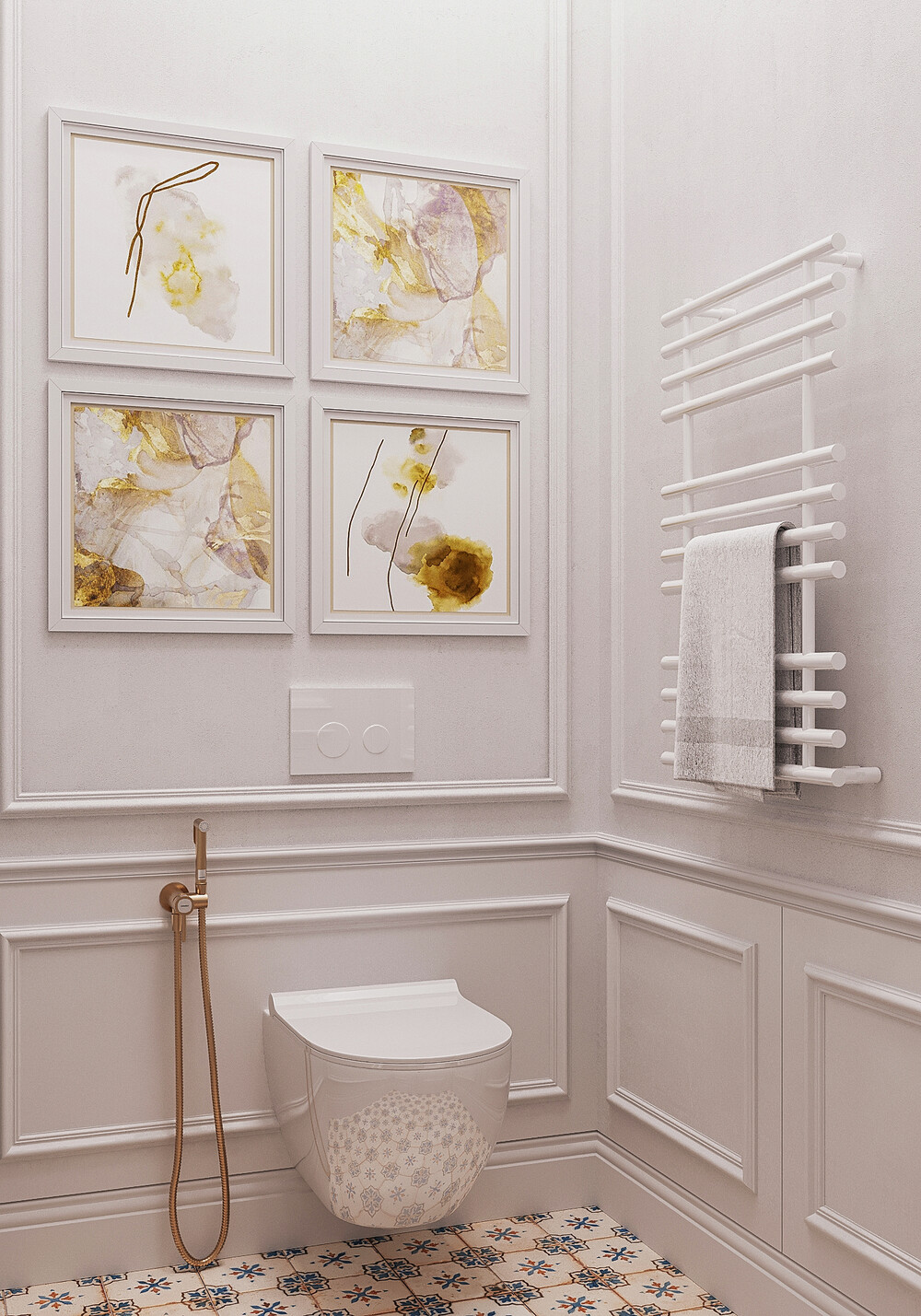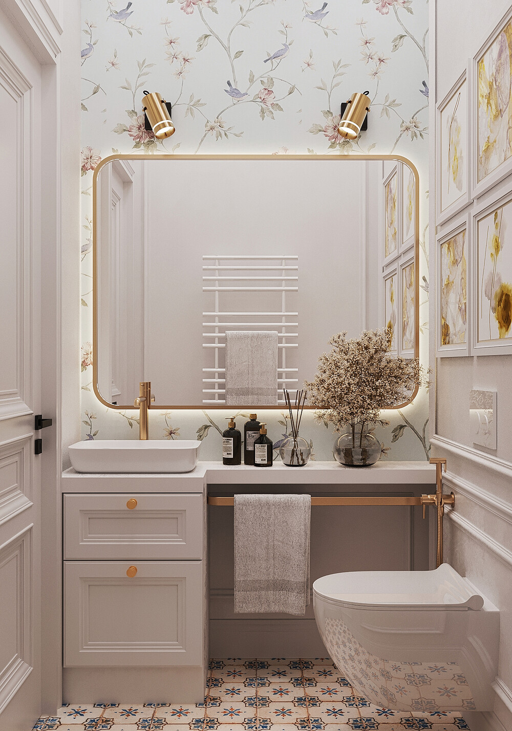 Этот санузел сделали более декоративным и насыщенным по деталям. На стенах классические панели соседствуют керамогранитом. На полу уложили акцентную плитку, которая сочетается с графичными светильниками. Латунная фурнитура поддерживает общую стилистику квартиры и делает маленькое помещение заметным.