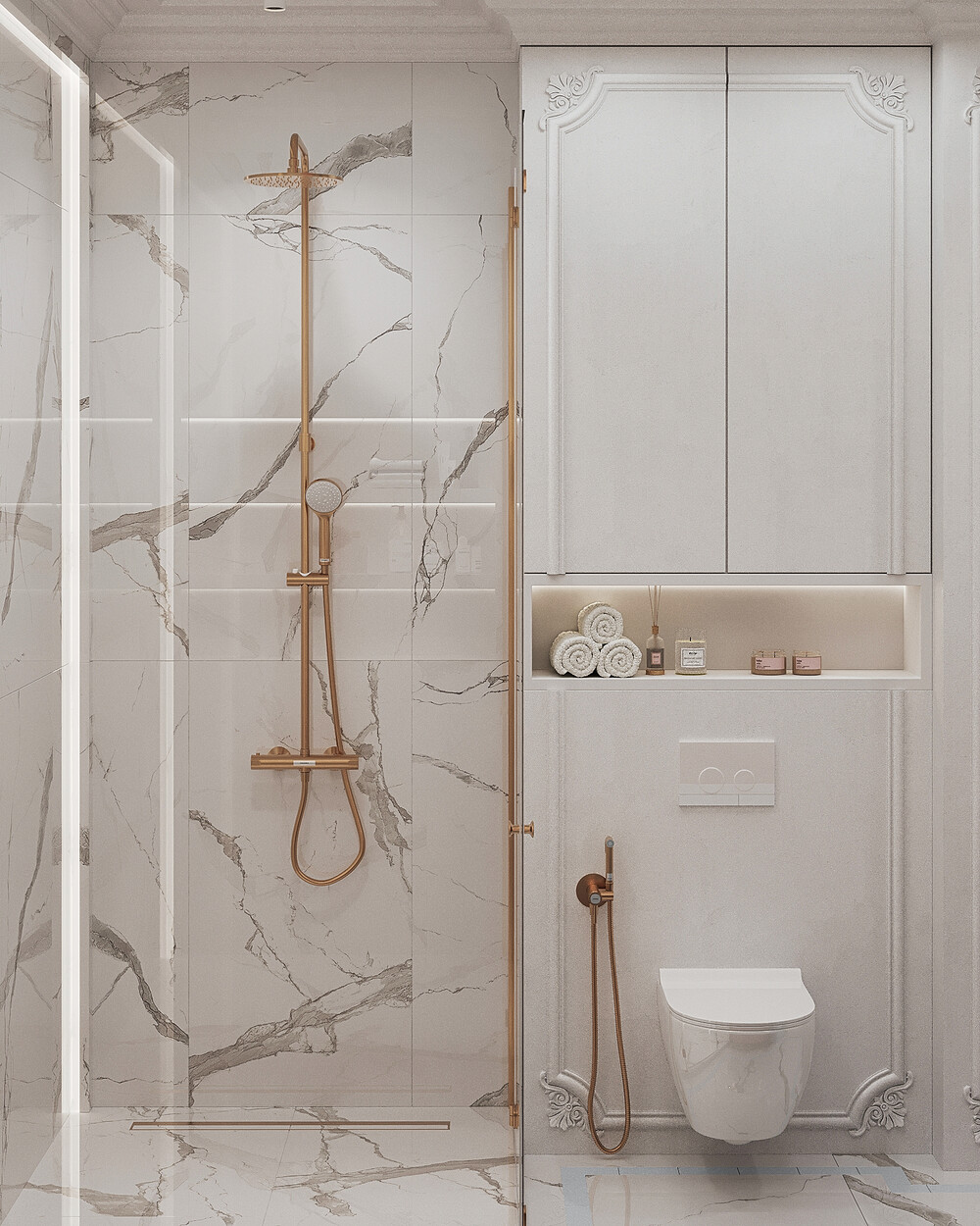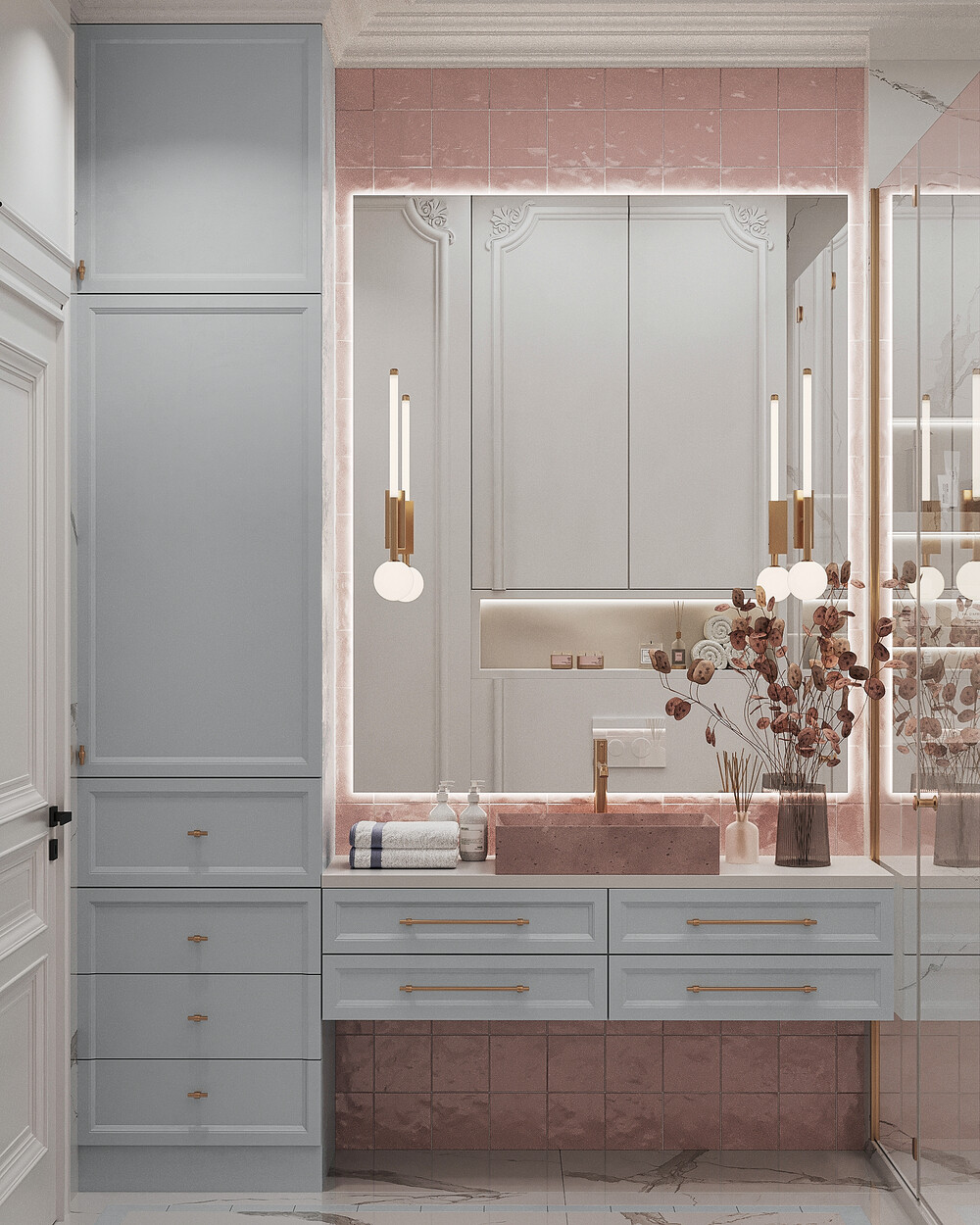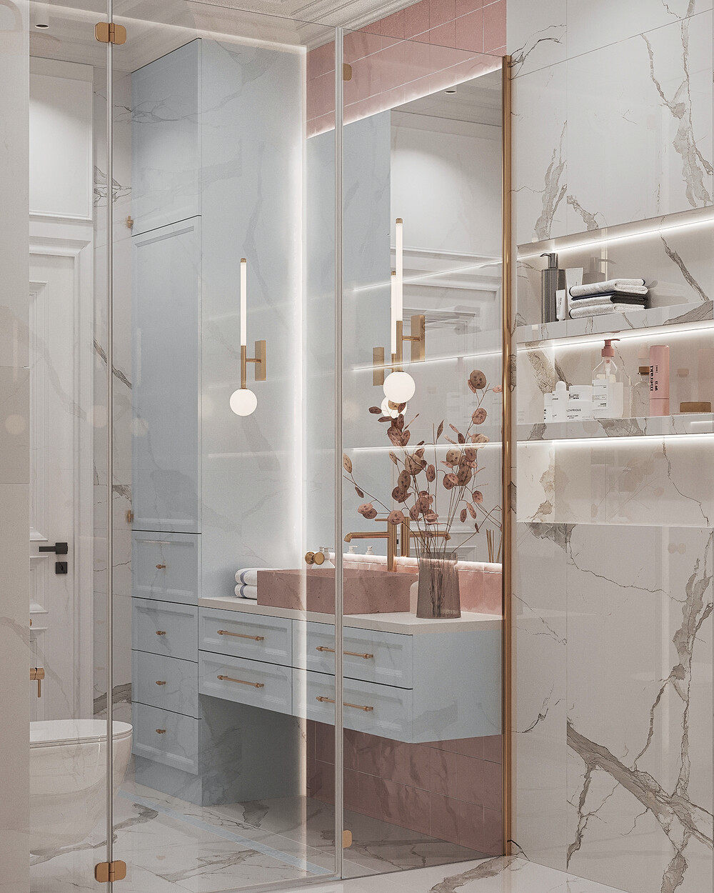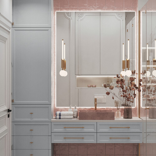 Для душевой выбрали сочетание мраморной текстуры и пудровых оттенков. Такое решение добавляет пространству визуальной глубины и делает его мягче. Латунная сантехника и скрытые системы хранения подчеркивают строгую геометрию помещения. Подсветка расставляет нужные акценты и выделяет фактуру отделочных материалов.