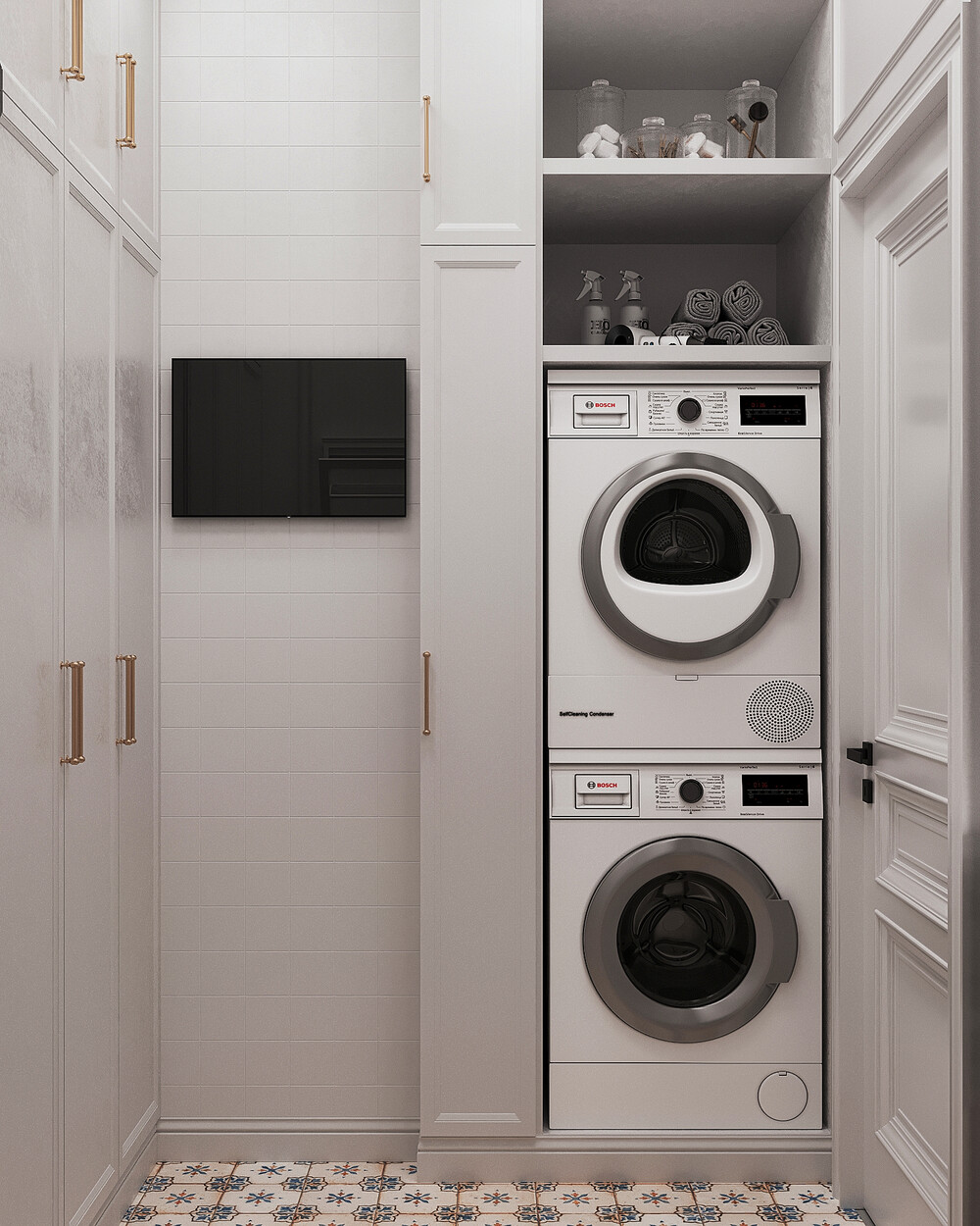 Светлая отделка и аккуратная раскладка плитки помогают пространству выглядеть опрятно. Классические фасады мебели связывают постирочную с дизайном остальных комнат в квартире.