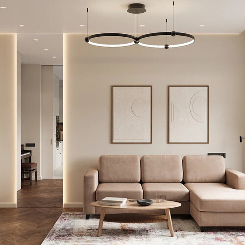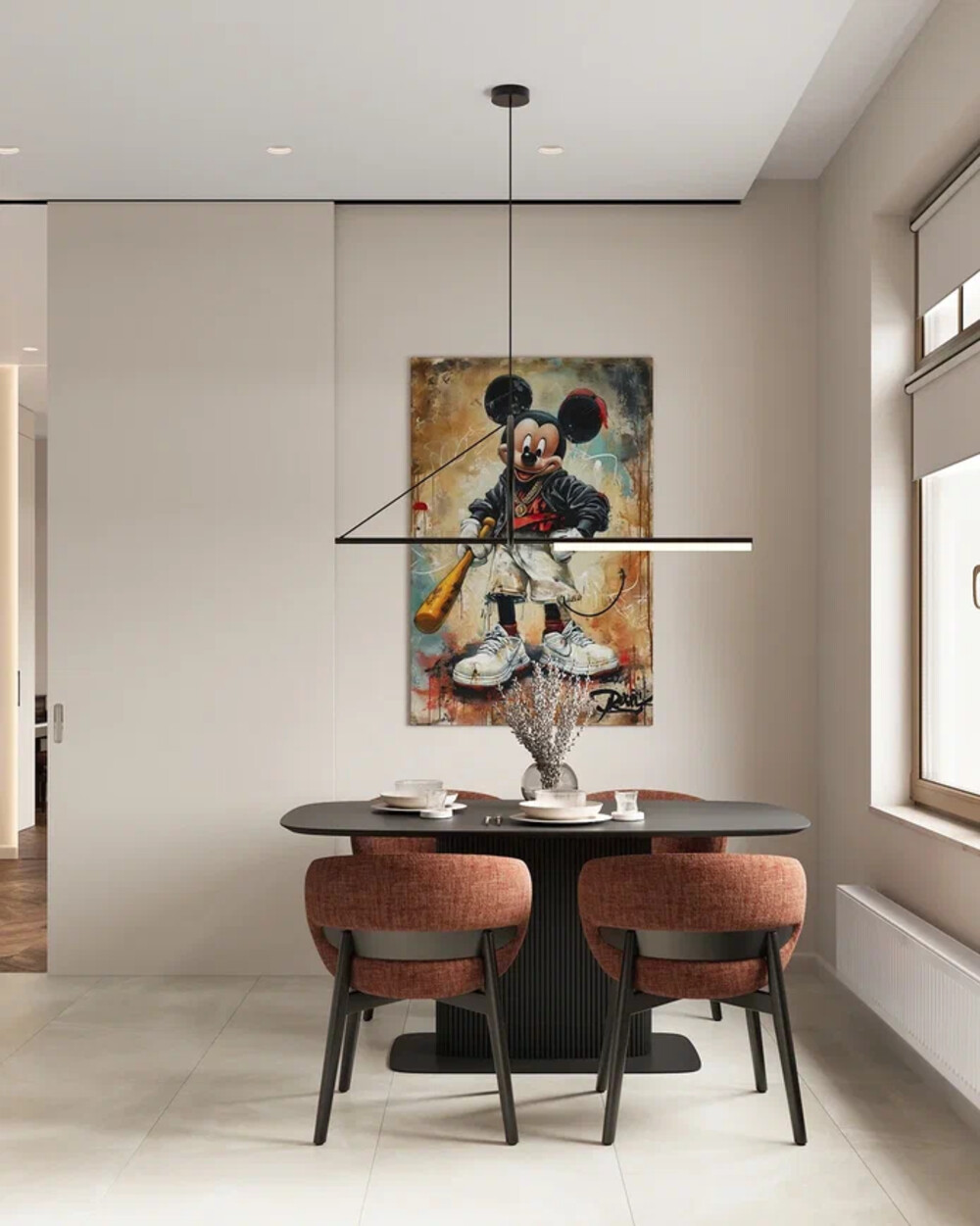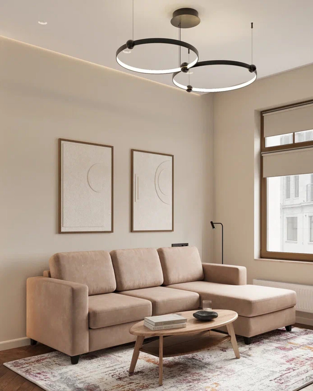 Яркие современные картины — выступают акцентами на нейтральном фоне интерьера.