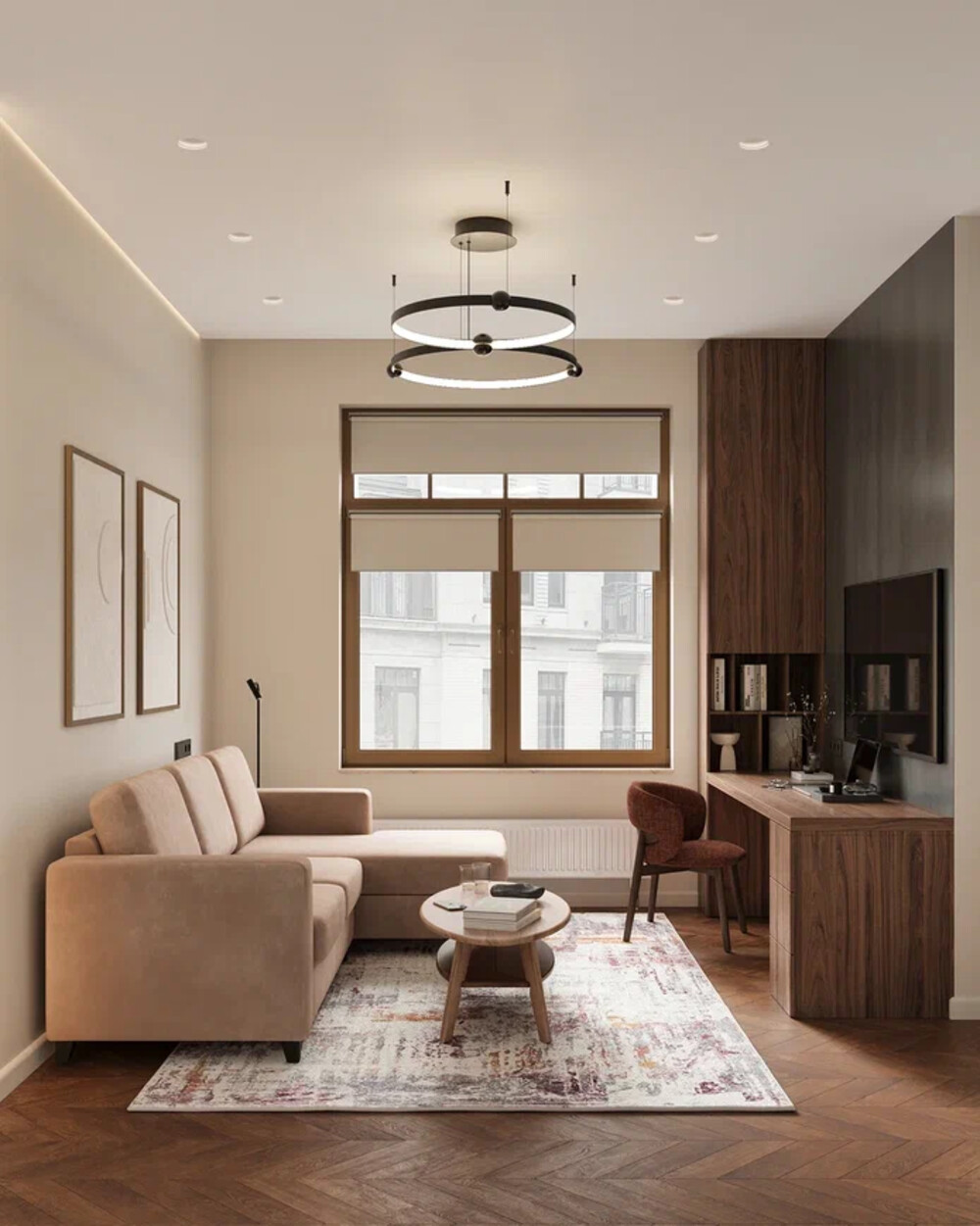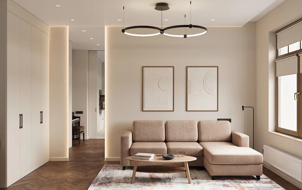 Интерьер выполнен в стиле современный минимализм: светлая база с контрастными и древесными акцентами. Основу составляют бежевые и серые оттенки стен. Декор дерева интегрирован в мебель, панели и общественные зоны, добавляя глубину пространству.
