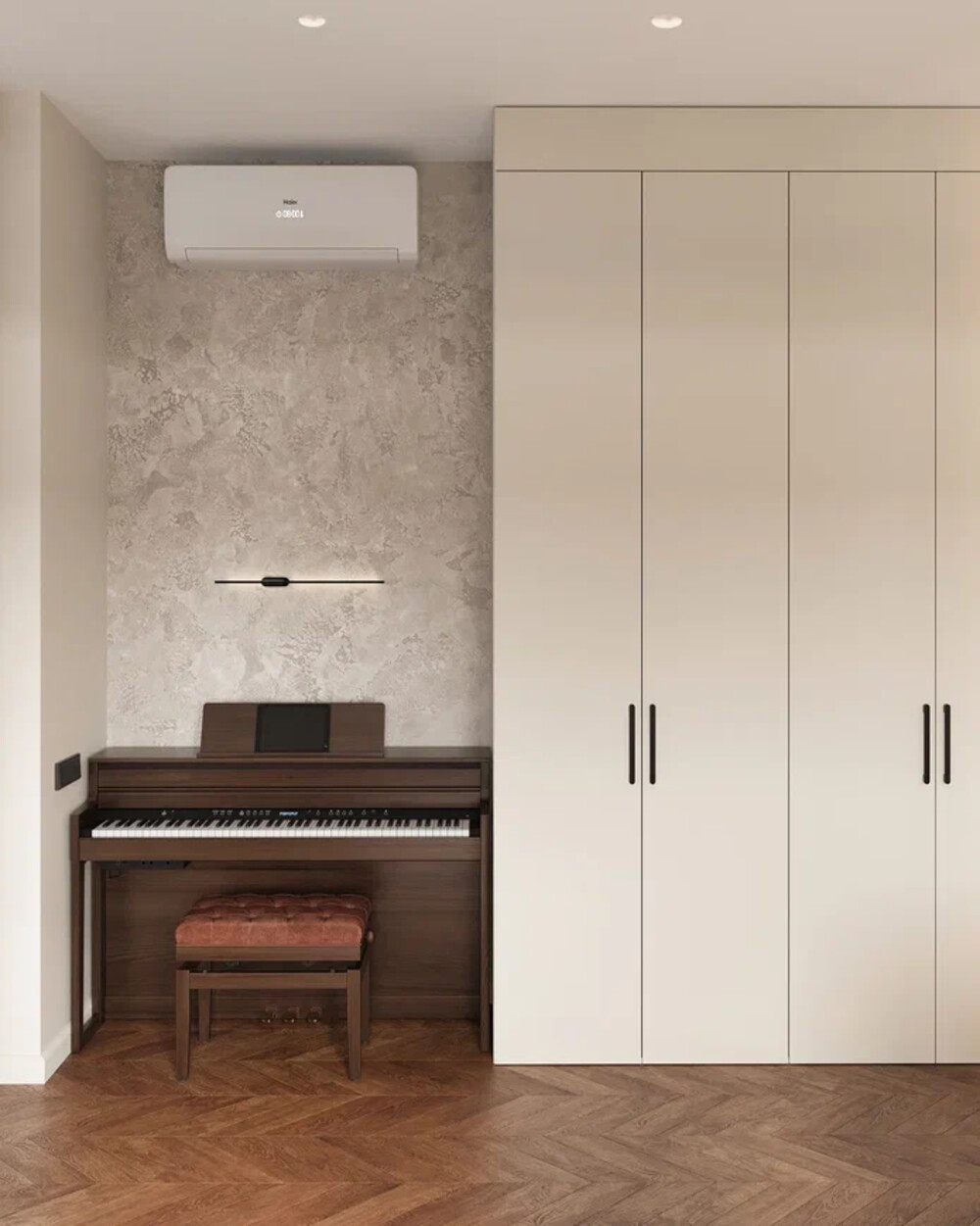 В гостиной — диван нейтрального оттенка с функцией раскладывания. Отдельно организована зона с пианино. Стена за инструментом выделена декоративной отделкой и подсветкой, что визуально фиксирует музыкальный уголок в общей композиции комнаты.