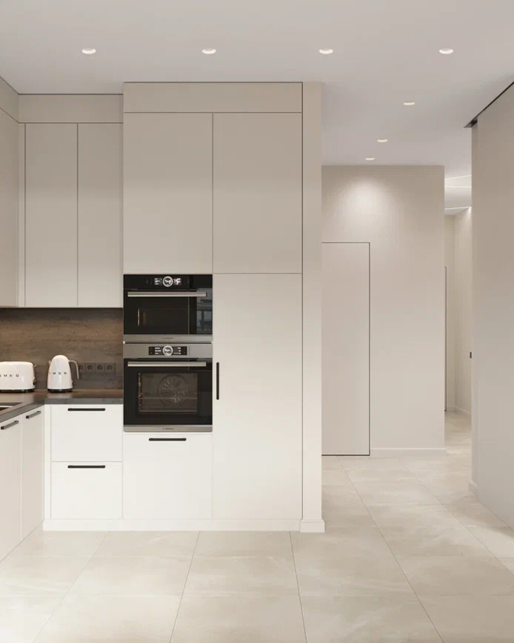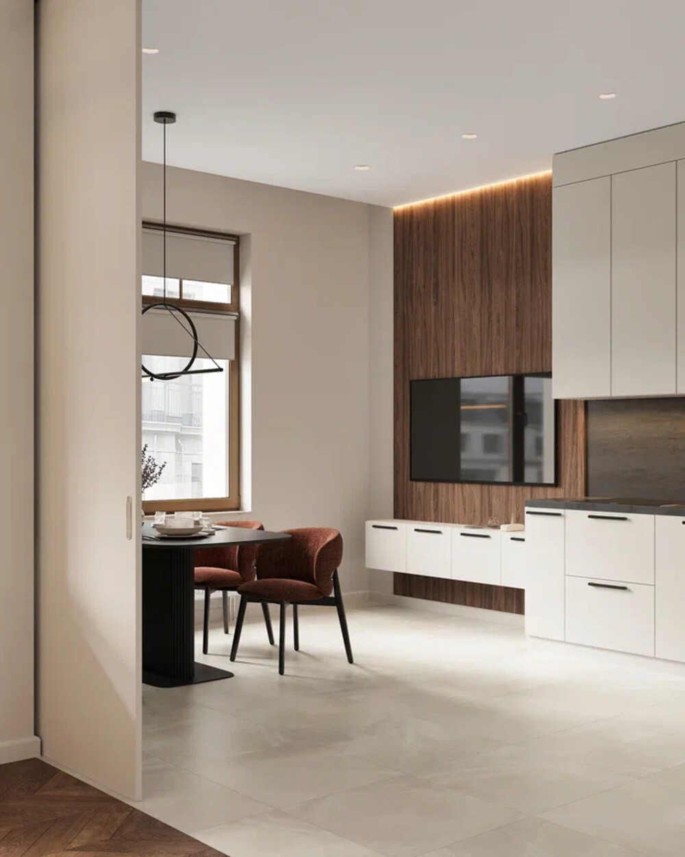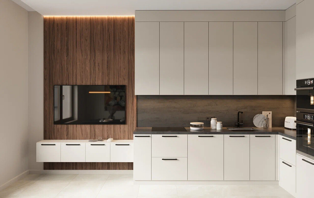 Кухня объединена с гостиной с возможностью разделения раздвижными дверями. Фасады выполнены в светлой гамме с древесными акцентами. Верхние и нижние шкафы формируют достаточный объём хранения для техники и бытовых принадлежностей. Рабочая зона оформлена крупноформатным фартуком.
