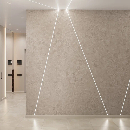 Подсветка в прихожей с переходом со стен на потолок — формирует дополнительную графику пространства.