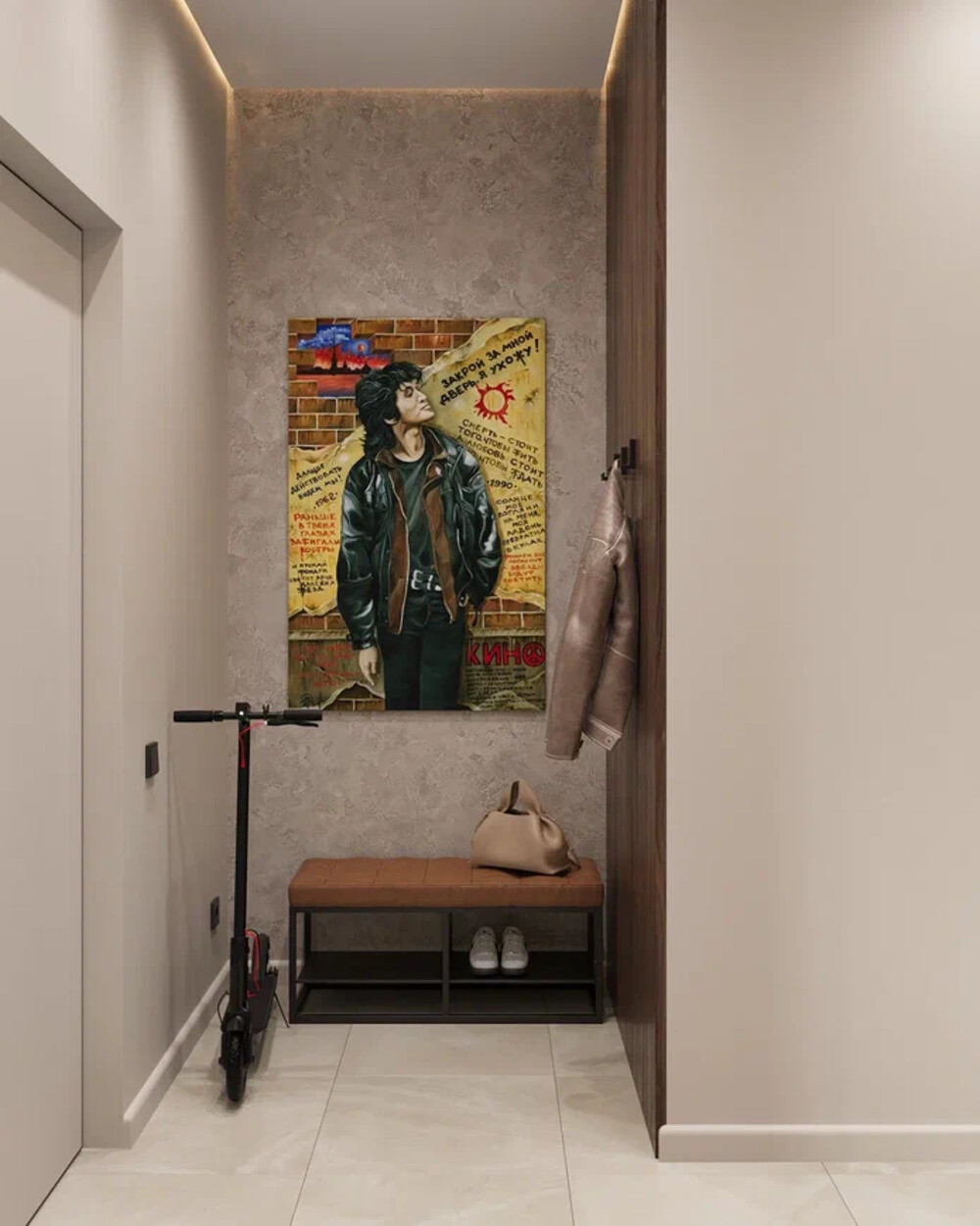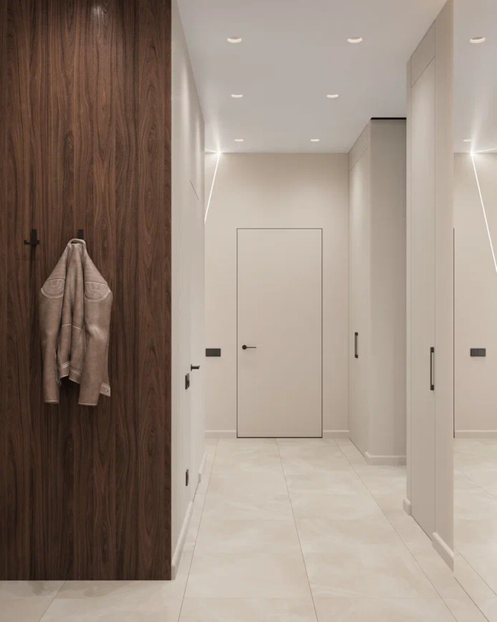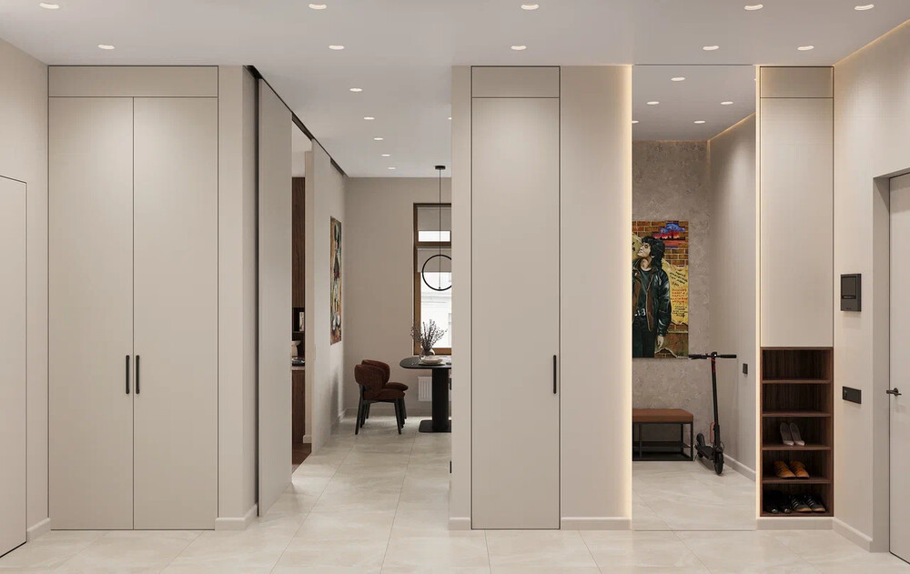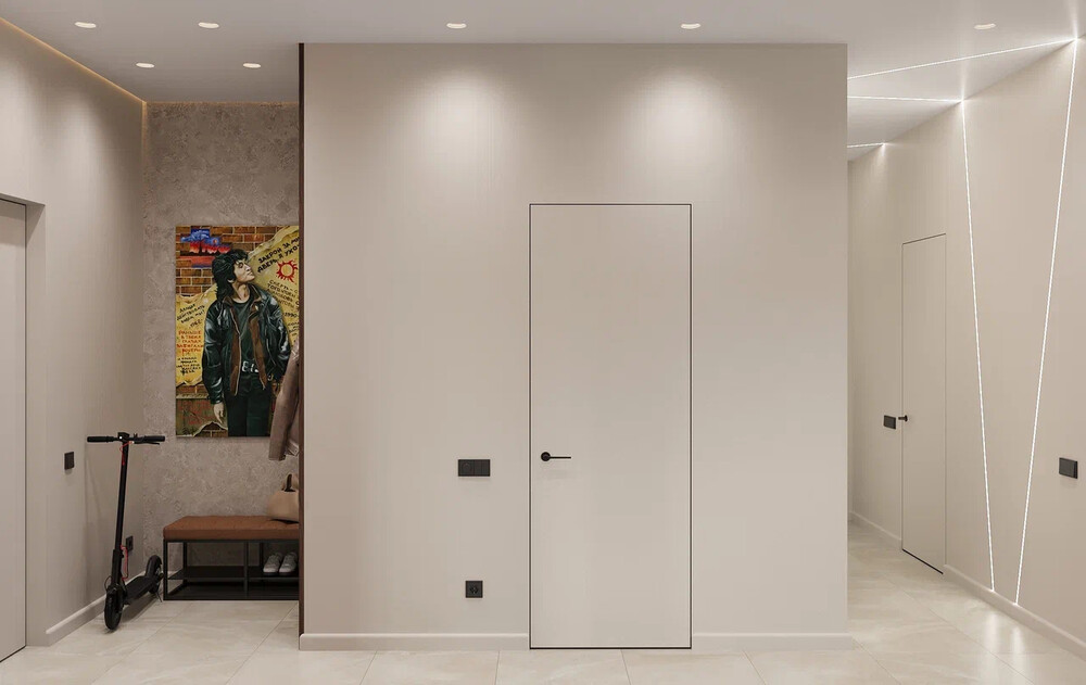 Зона переобувания дополнена скамьёй и открытыми полками. Акцентом стала яркая картина в нише и профильная подсветка, переходящая со стен на потолок. Все двери выполнены в скрытом формате. На полу — крупноформатный керамогранит с минимальным количеством швов.