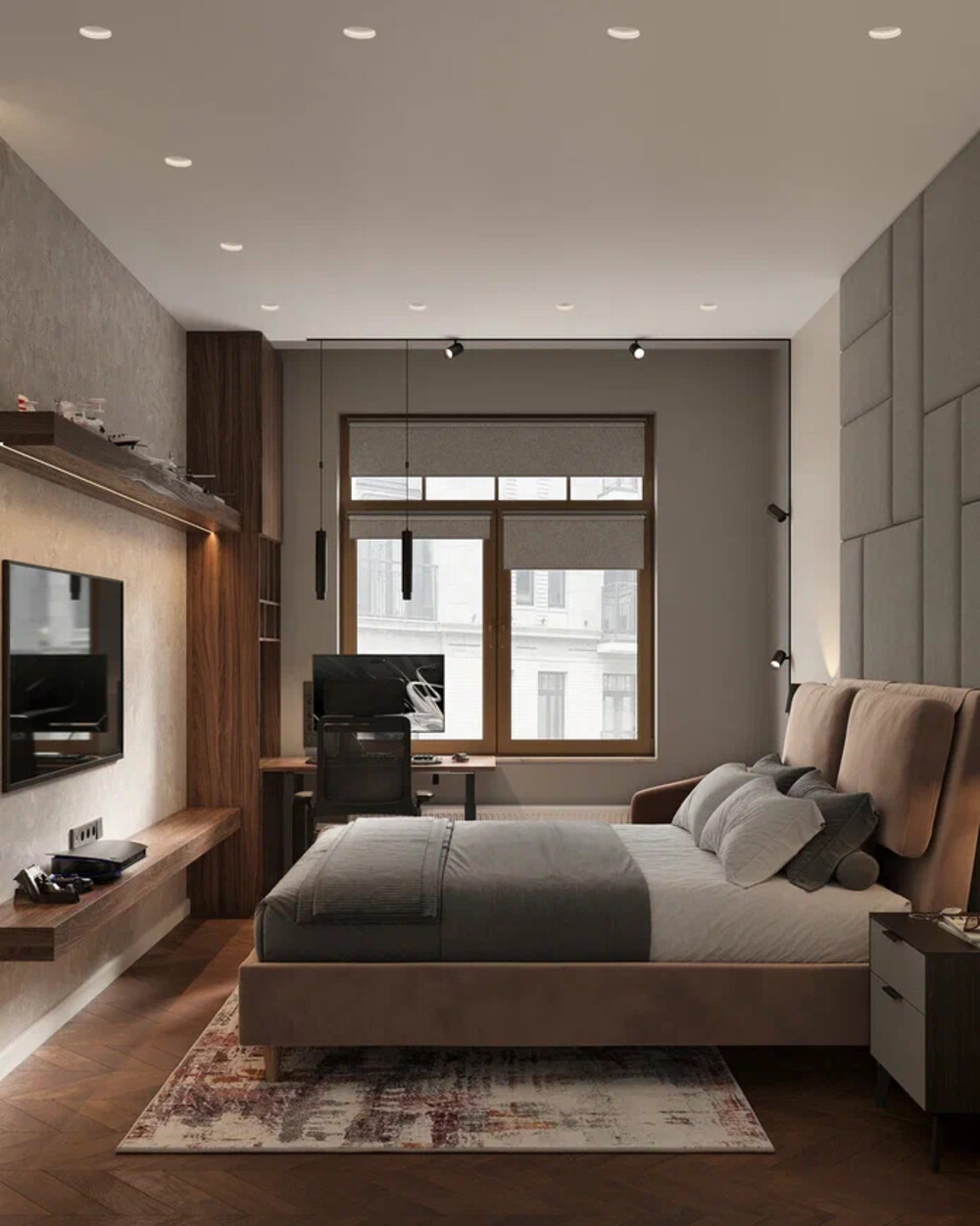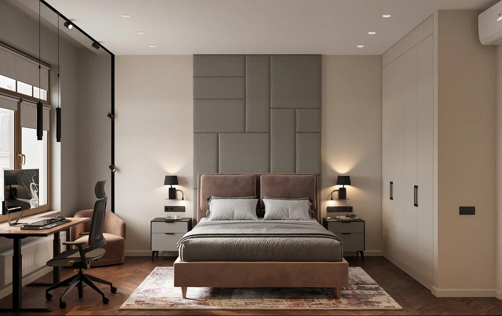 Спальня выполнена в светлой палитре с изголовьем кровати из мягких панелей. По обе стороны размещены прикроватные тумбы и бра для локального освещения. У окна организована рабочая зона со столом и компьютерной техникой.