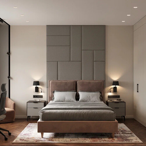 Текстильное изголовье кровати — формирует акцент спальни.