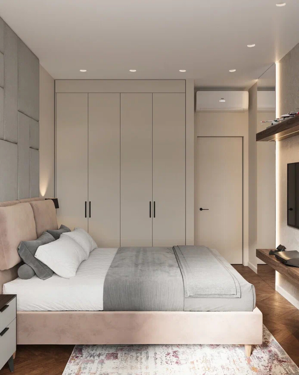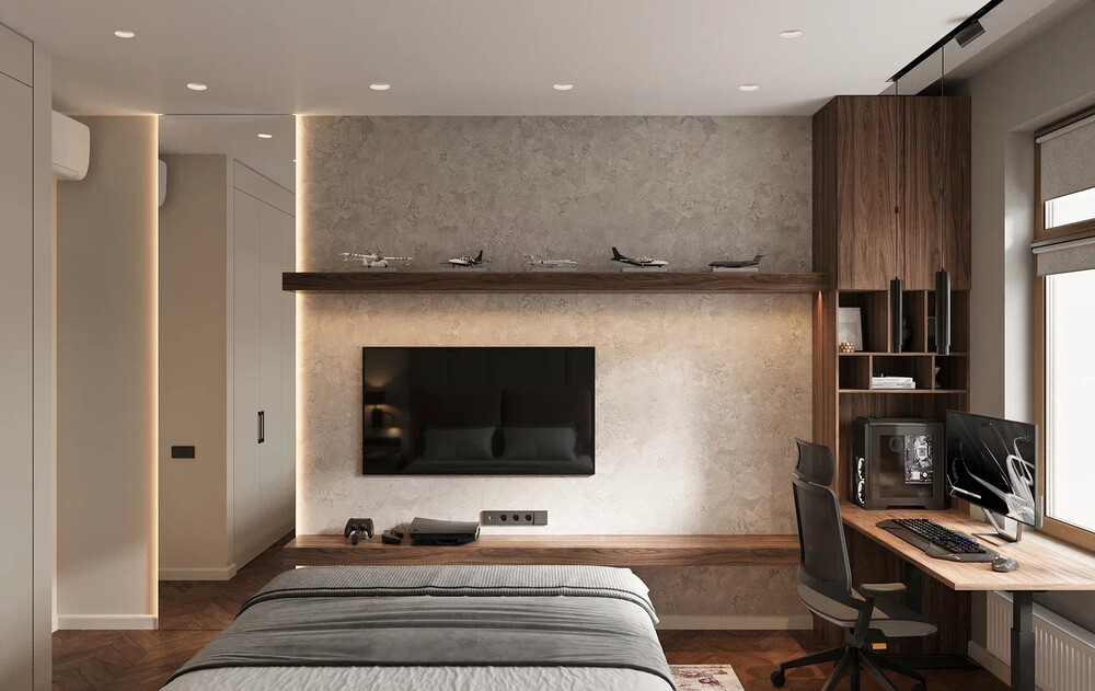 Встроенные шкафы от пола до потолка предназначены для хранения одежды и личных вещей. Напротив кровати расположена ТВ-зона с древесными полками, где размещена коллекция моделей самолётов. Подсветка и сочетание дерева, текстиля и декоративной штукатурки добавляют интерьеру глубину и визуальное разнообразие.
