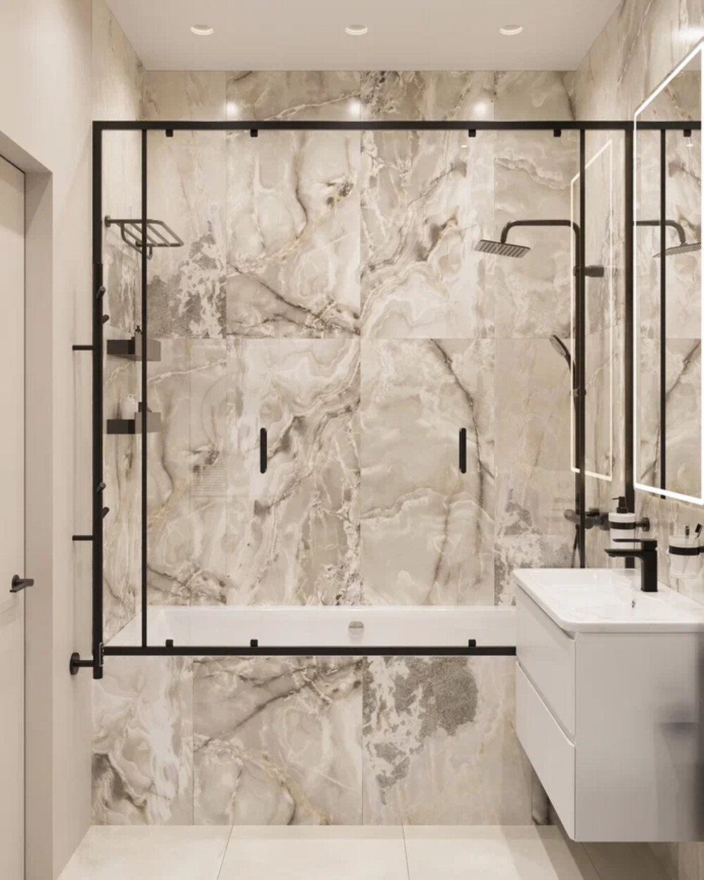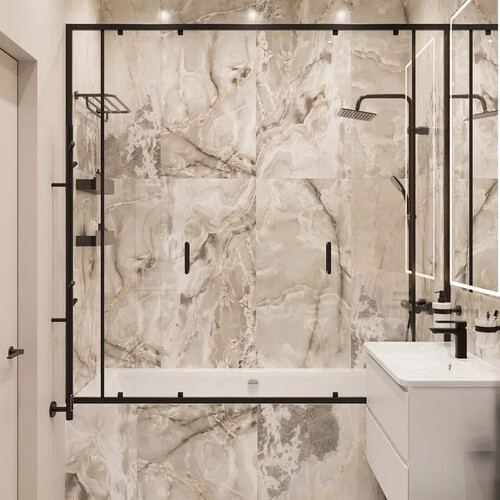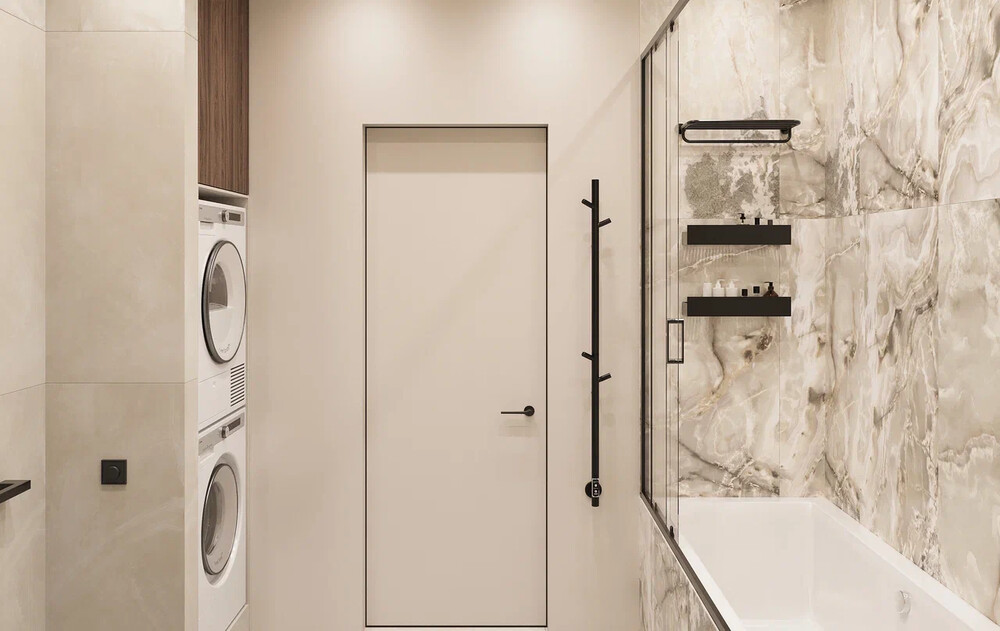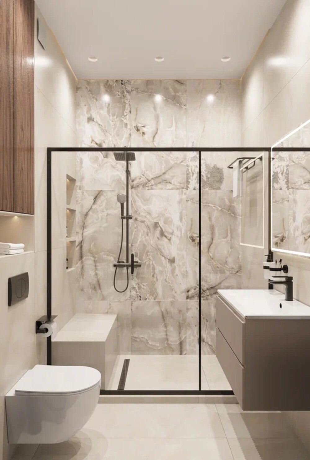 Помещение оформлено в светлой гамме с использованием крупноформатного керамогранита под камень и древесных акцентов. Зона ванны отделена прозрачной перегородкой с чёрным профилем.