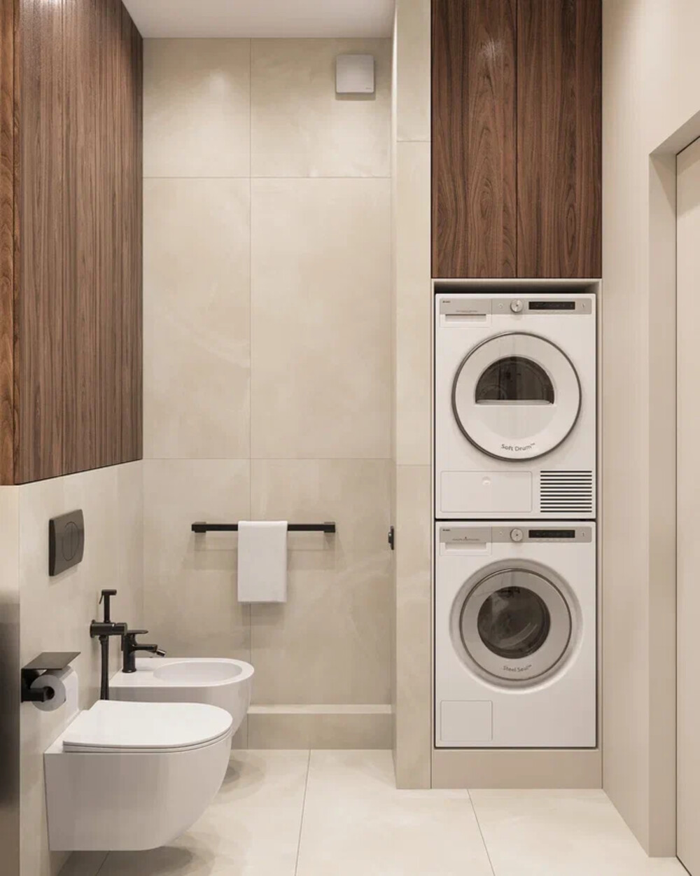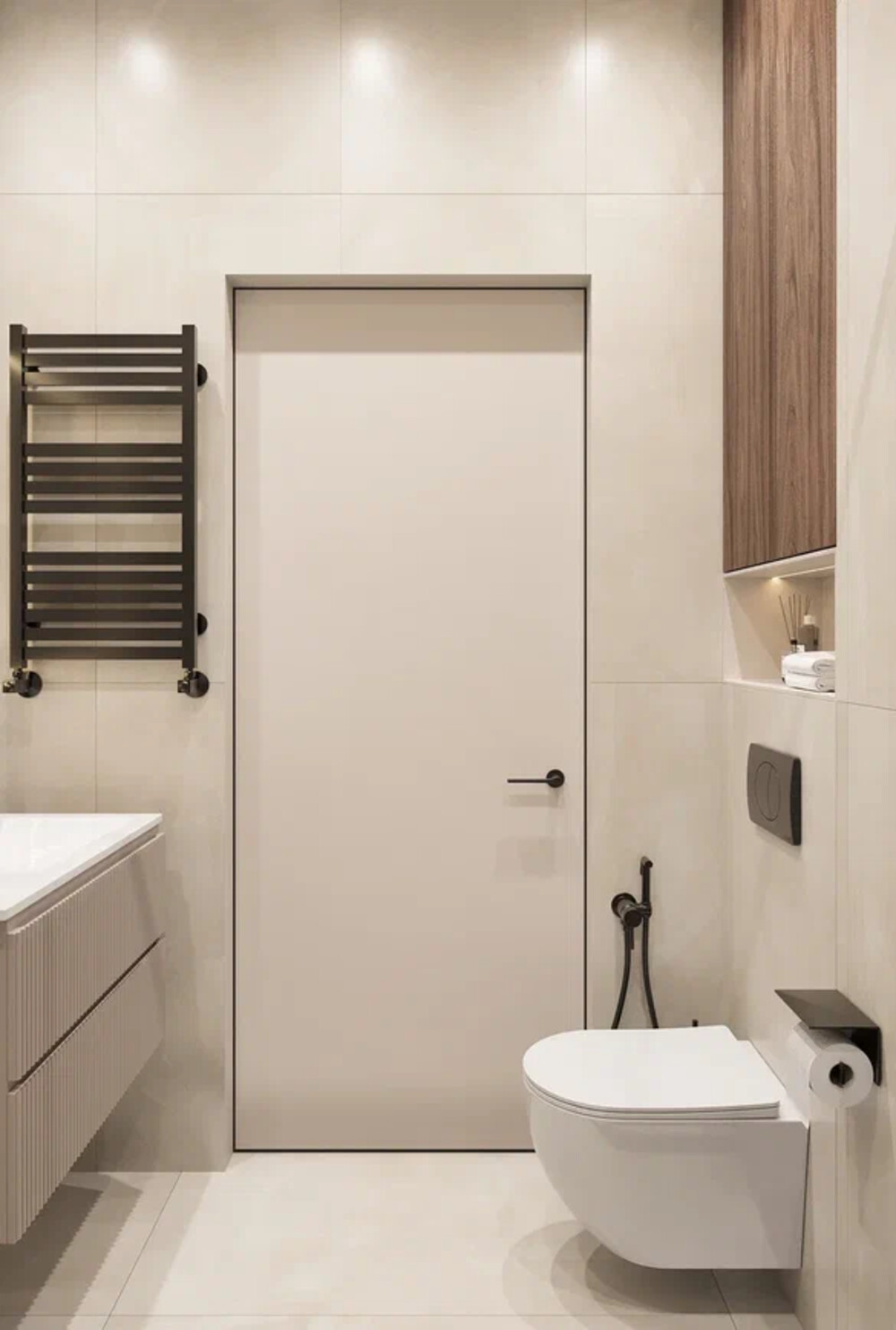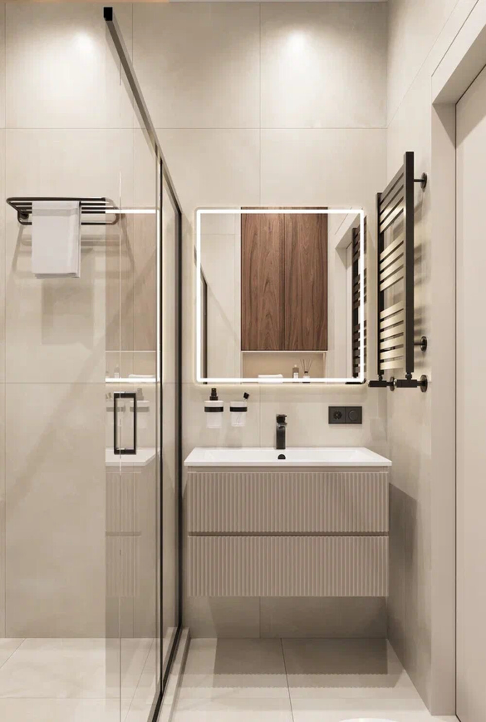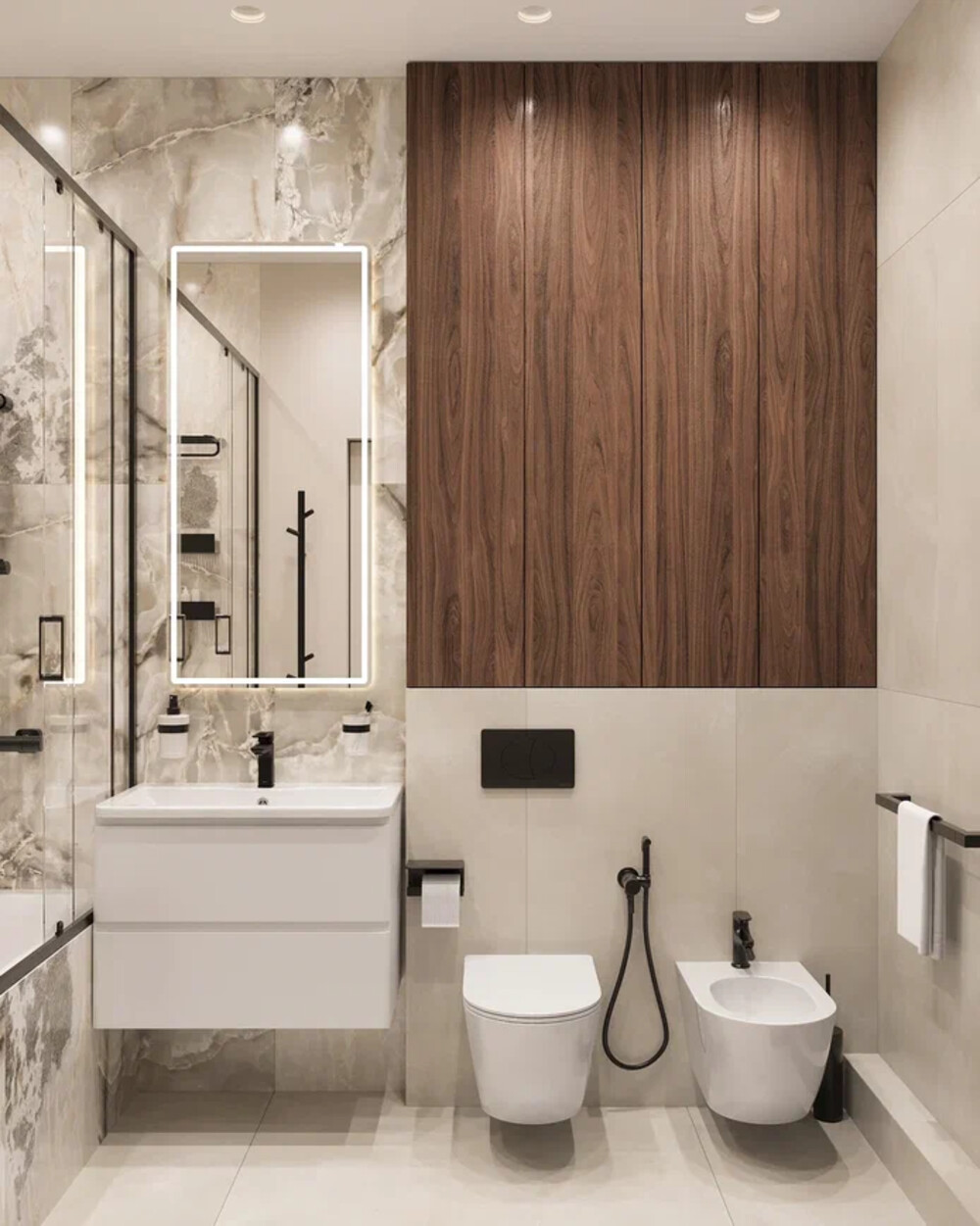 Подвесная тумба с фактурными фасадами и зеркало с подсветкой поддерживают современную линию интерьера. Дополнительное хранение интегрировано в шкафы над инсталляцией.