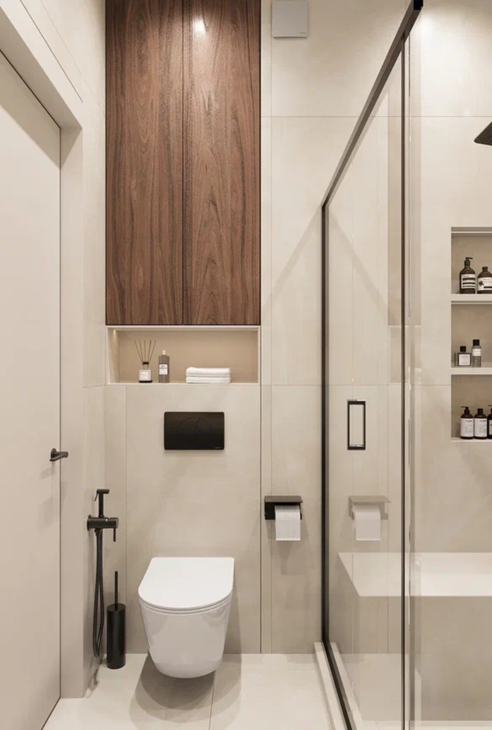 Компактный санузел выполнен в той же стилистике. Использованы светлые поверхности, натуральные текстуры и чёрная фурнитура. Душевая ограждена стеклянной перегородкой, внутри предусмотрены сиденье и ниши для аксессуаров.