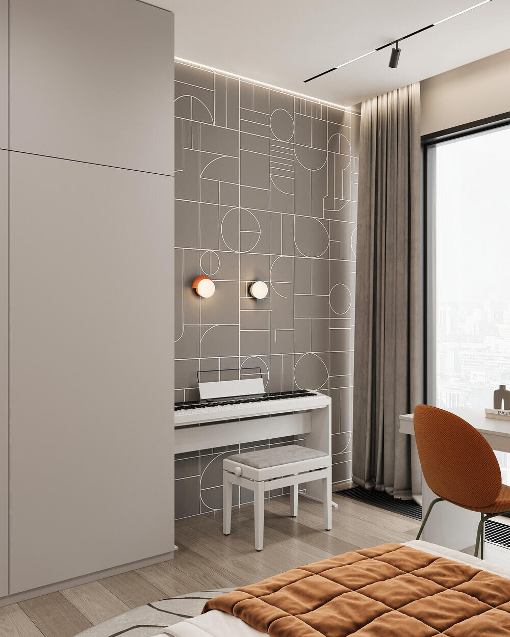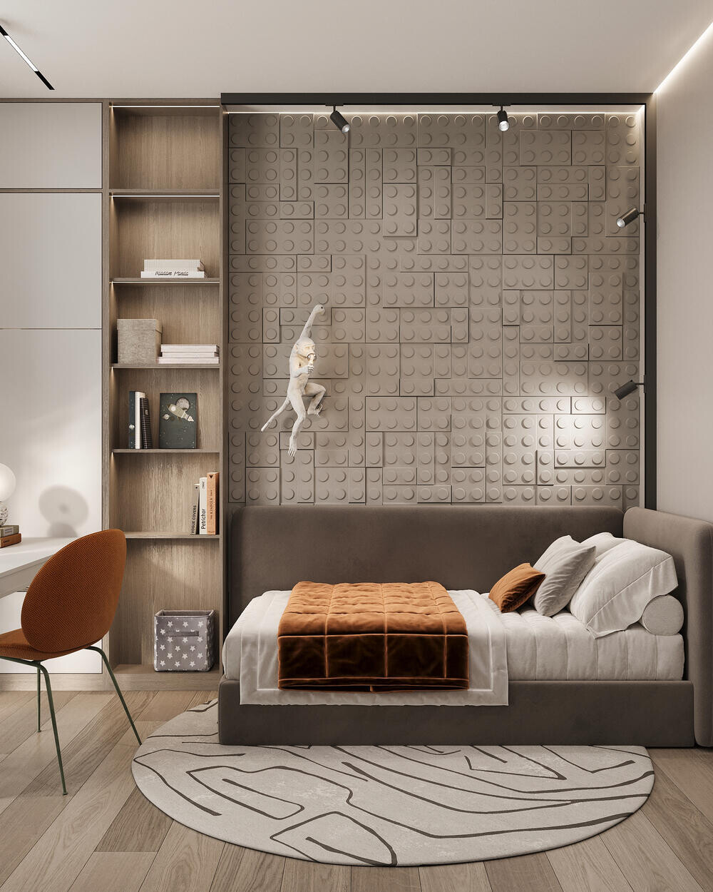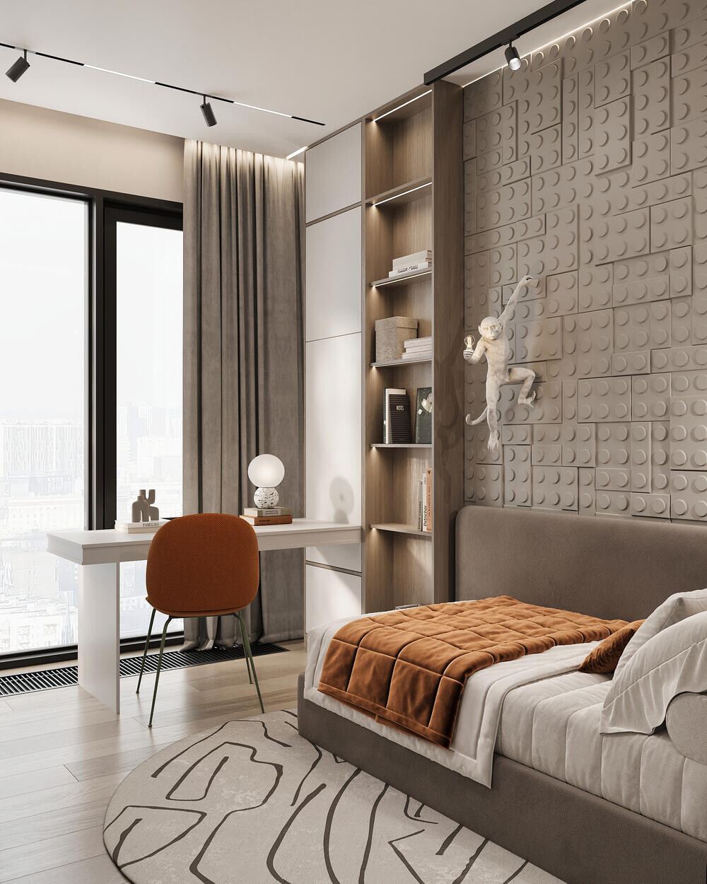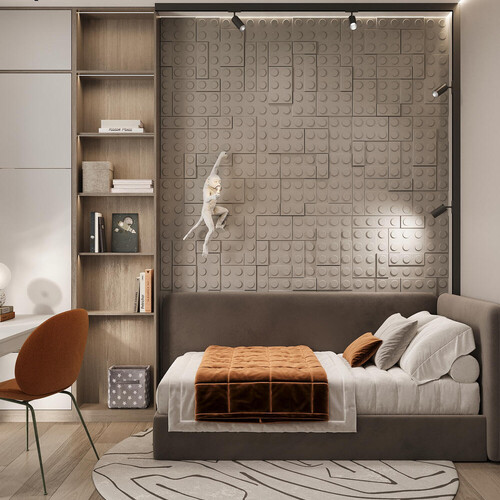 Эта детская выполнена в светлой гамме с акцентной стеной из 3D-панелей в стиле LEGO и декоративной фигурой обезьяны, которая сразу притягивает взгляд. Кровать с мягким изголовьем расположена вдоль стены, рядом — рабочий стол у окна и встроенные шкафы. Декор делает комнату живой, при этом планировка остаётся простой и понятной.