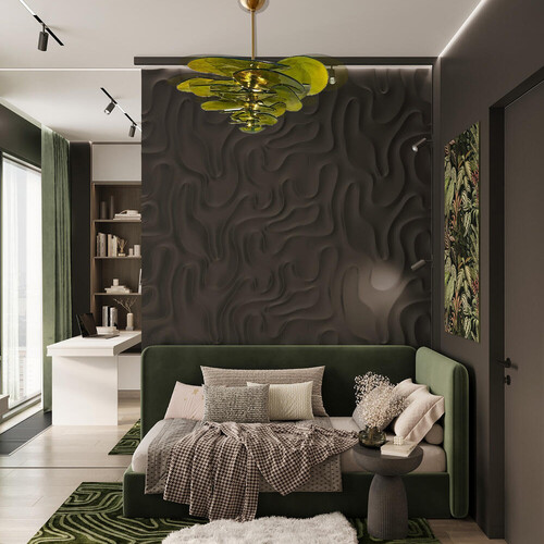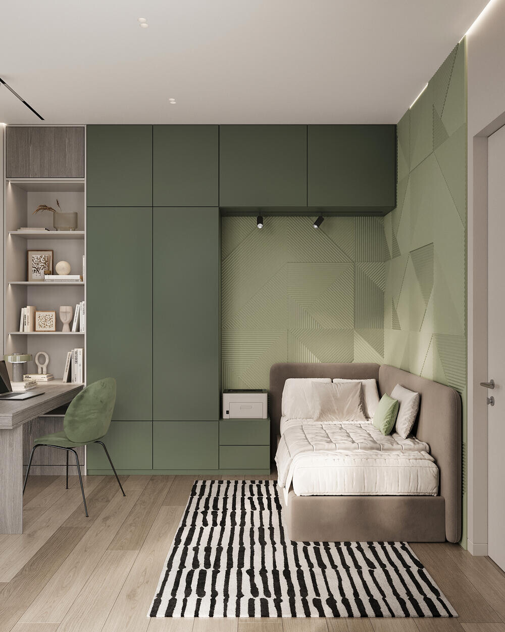 Вторая детская решена в спокойной зелёно-бежевой палитре с акцентной стеной из рельефных панелей геометрической формы. Зону кровати выделили за счёт шкафов — они формируют нишу и одновременно закрывают вопрос хранения. Рабочий стол расположен у окна, поэтому пространство логично делится на сон и учёбу без перегрузки мебелью.