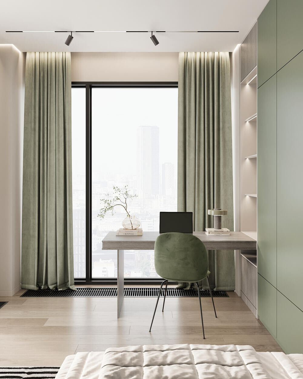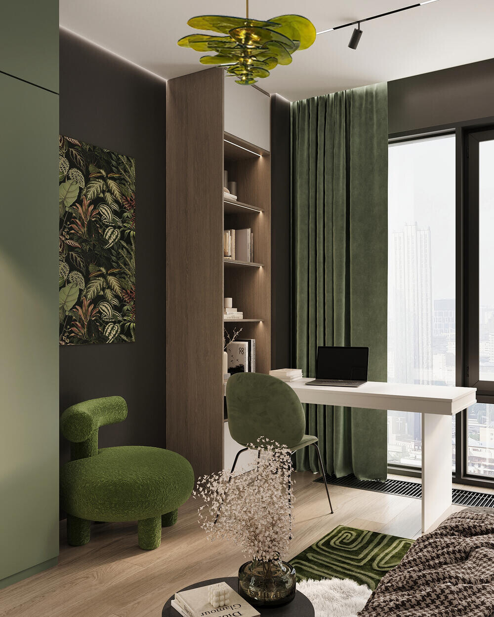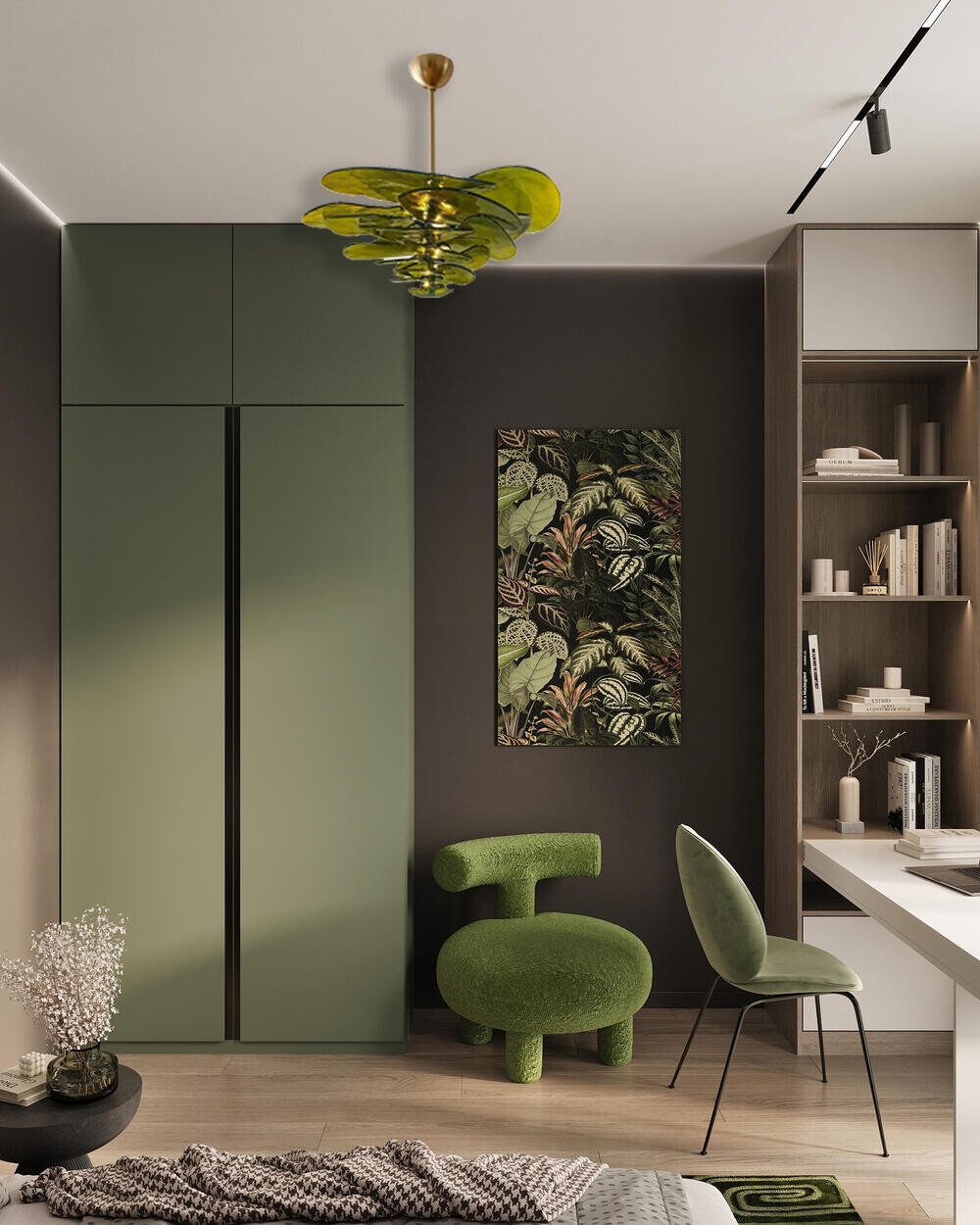 Систему хранения сделали заметной частью интерьера: высокий шкаф в матовом зелёном цвете занимает стену и собирает пространство. В зоне отдыха предусмотрен компактный диван в зелёной обивке и небольшой столик. Крупный светильник с зелёными стеклянными элементами и панно с ботаническим принтом поддерживают цветовую тему.