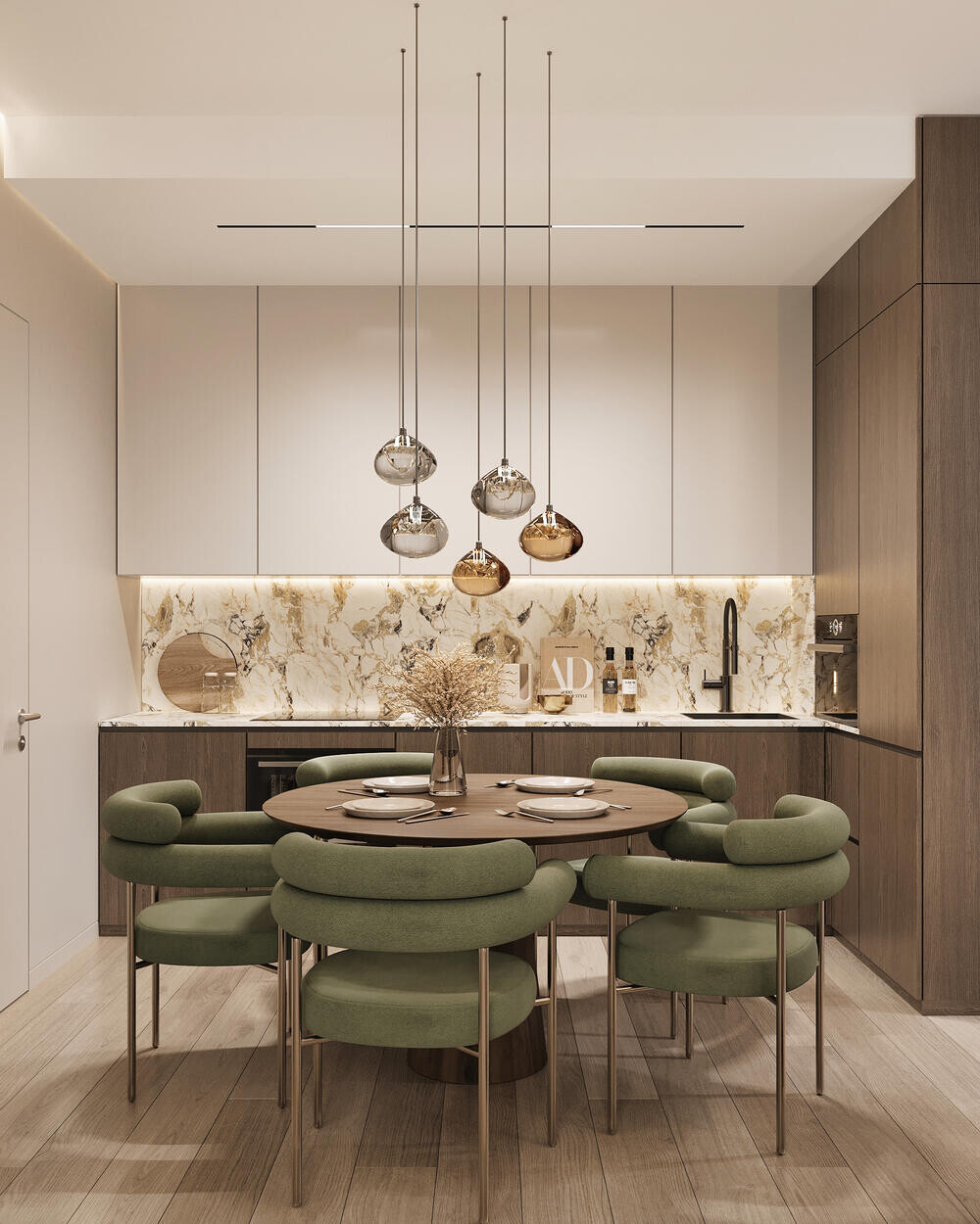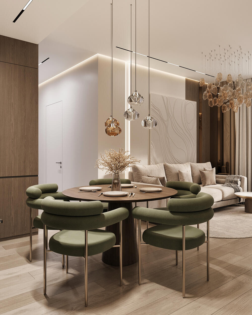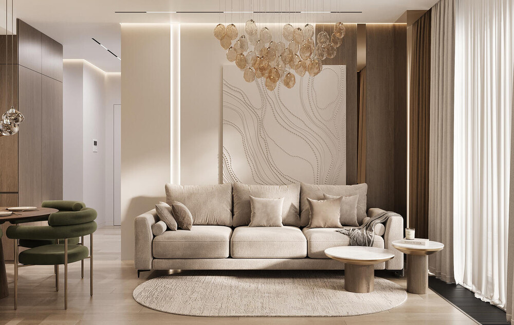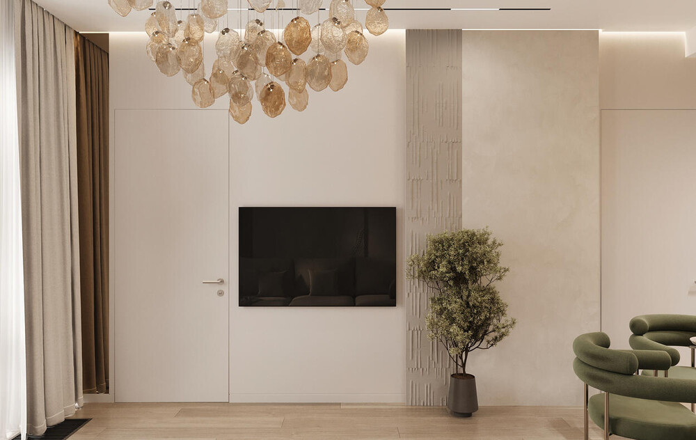 Интерьер выполнен в современном стиле с элементами джапанди. Цветовая база построена на тёплых светлых и древесных оттенках, которые делают пространство визуально легче. Зелёные акценты добавлены дозированно — через мебель, панели и декор, чтобы интерьер выглядел цельно и спокойно.