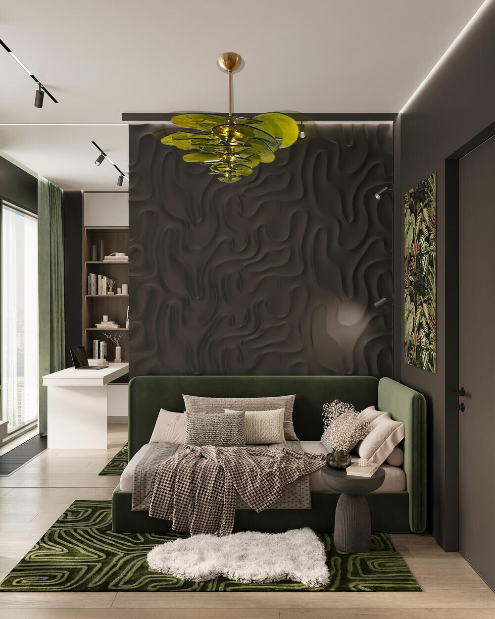 Кабинет отделён от зоны отдыха перегородкой: со стороны дивана она выглядит как фактурная акцентная стена, а со стороны рабочего места работает как чёткая граница. Палитра здесь темнее, чем в остальных помещениях: графитовые стены, глубокие зелёные акценты и тёплое дерево в мебели. Рабочий стол установлен у окна, рядом — высокий стеллаж для книг и декора.