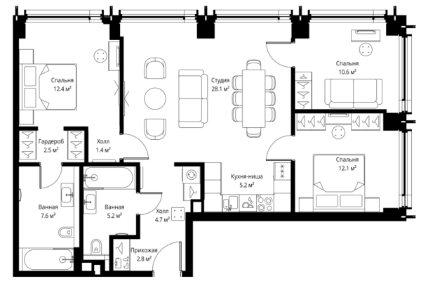 Просторная квартира с тремя изолированными спальнями, кабинетом и общей зоной кухни-гостиной. Кухню разместили в отдельной нише — рабочая зона визуально отделена. Гостиная объединена со столовой и стала центральной точкой квартиры. Большой холл связывает все помещения, не перегружая площадь и создавая ощущение воздуха уже с порога. В квартире предусмотрены два санузла и гардеробная, что заметно повышает комфорт в повседневной жизни.