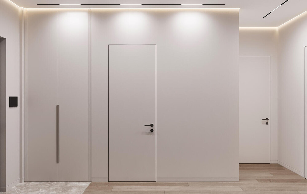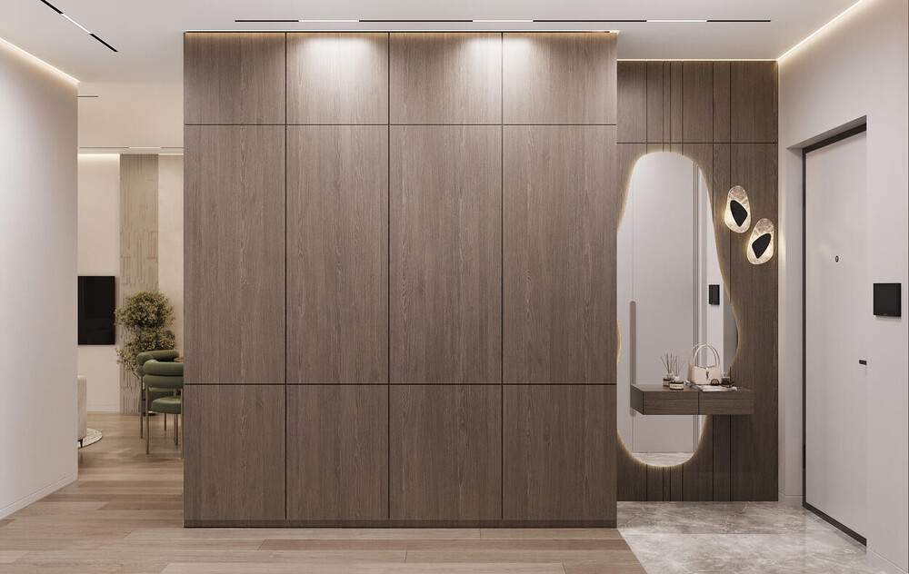 Прихожая оформлена со встроенными шкафами во всю высоту стены, которые скрыты за фасадами под дерево. Система хранения занимает целую плоскость и воспринимается как архитектурный объём. Акцентная панель с зеркалом асимметричной формы дополнена компактной консолью для ключей и мелочей. Встроенная подсветка подчёркивает форму зеркала и мягко отделяет входную зону от остального пространства квартиры.