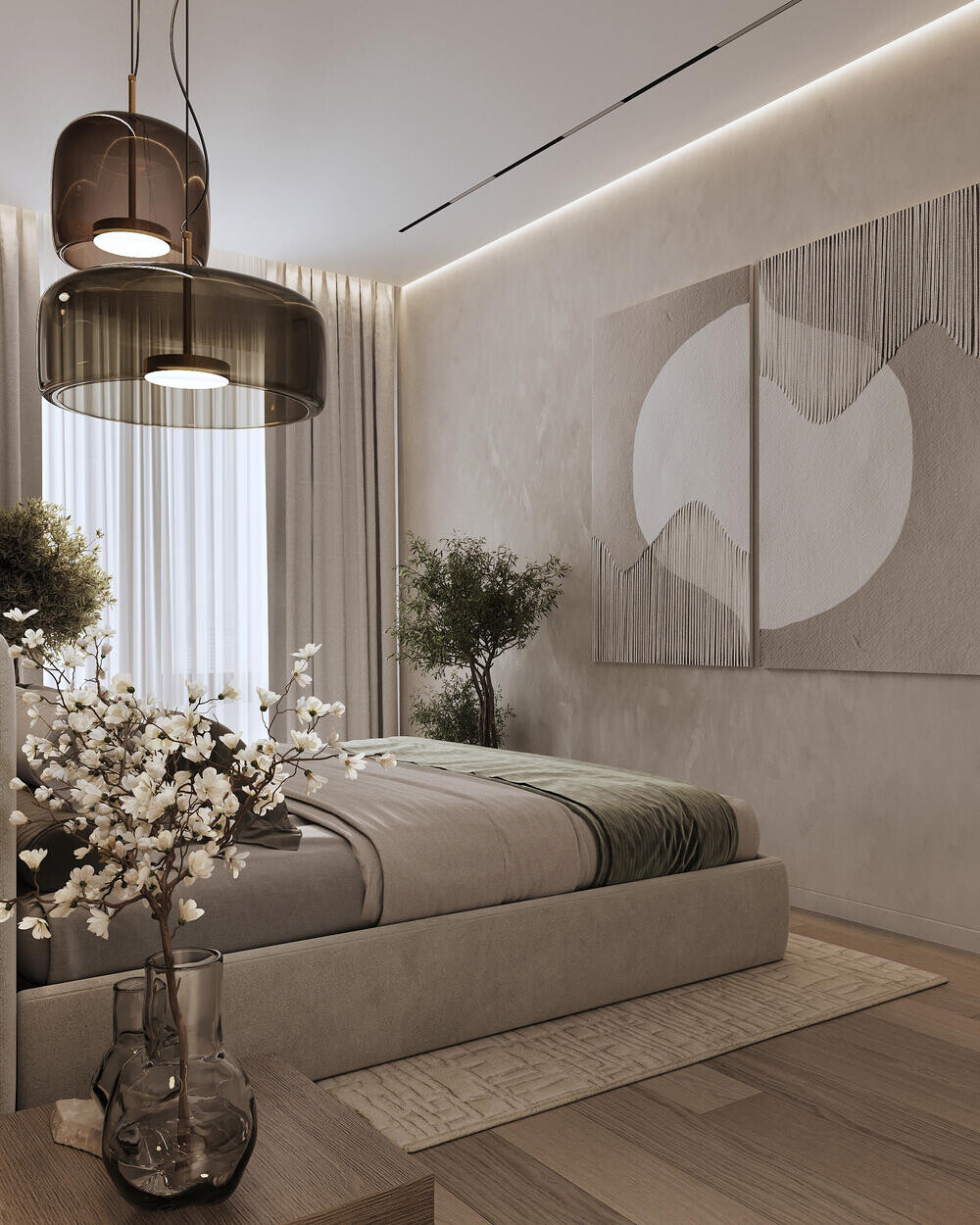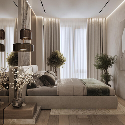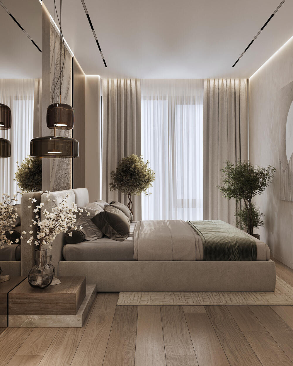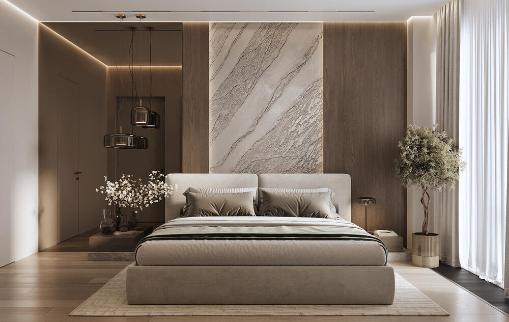 Главная спальня выполнена в спокойной светлой палитре с акцентом на фактуры. Кровать с мягким изголовьем установлена по центру комнаты, стену за ней выделили панелями под дерево и крупной вставкой с каменным рисунком. По обе стороны предусмотрены прикроватные тумбы и подвесные светильники, которые освобождают поверхность. Вместо классического настенного декора использованы текстурные панно и композиции, добавляющие глубину.