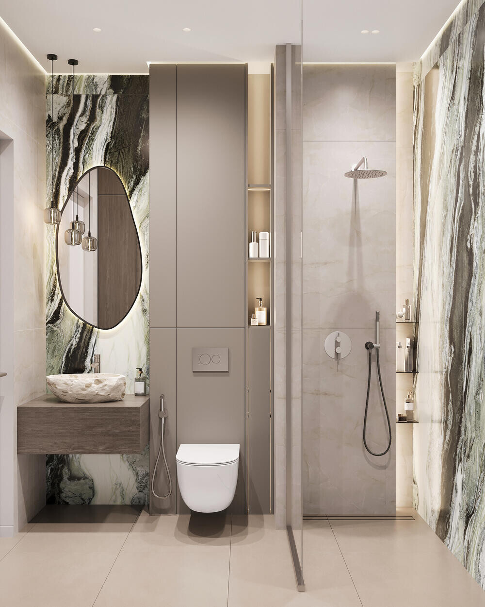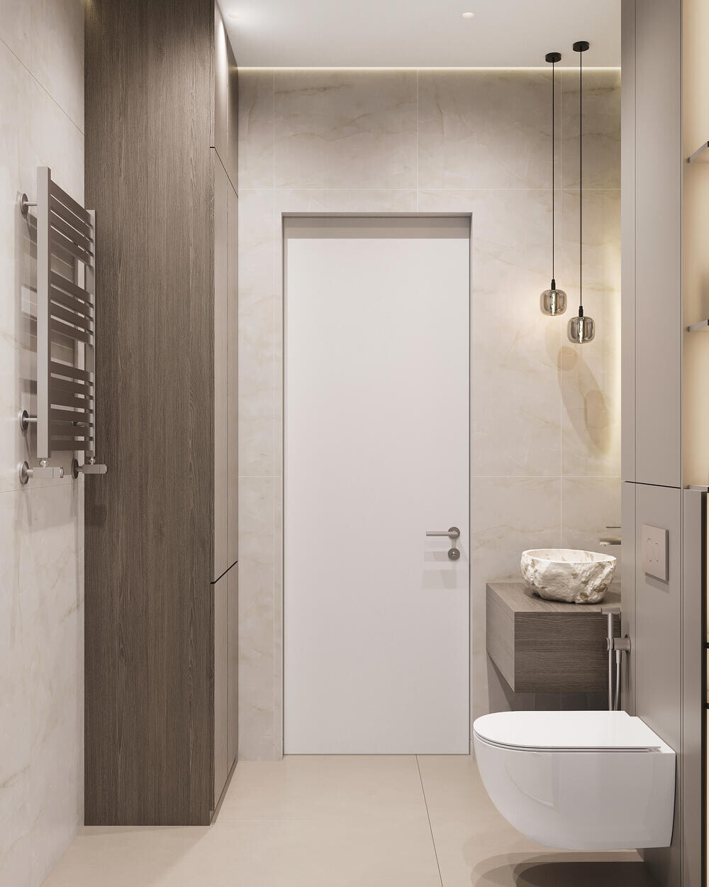 Стены оформлены светлой крупноформатной плиткой под камень — за счёт этого помещение выглядит цельно и аккуратно. Установлены подвесной унитаз с инсталляцией и компактная тумба с каменной раковиной-чашей, инженерия и хранение скрыты во встроенных шкафах. Дополняют интерьер полотенцесушитель и точечные светильники.