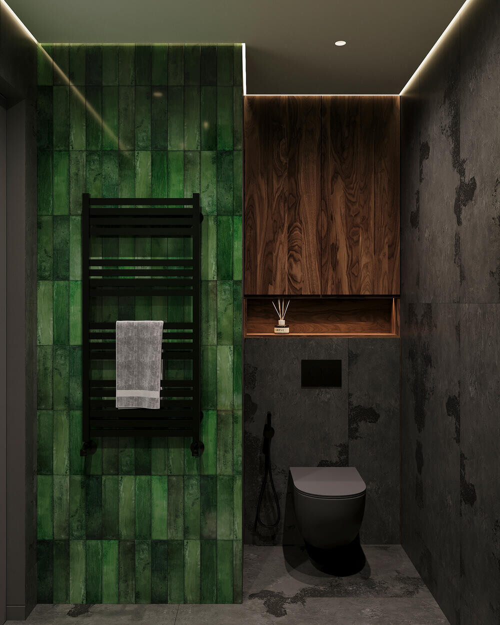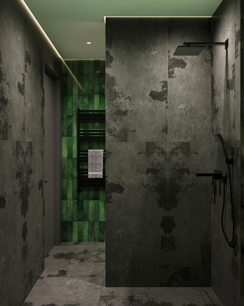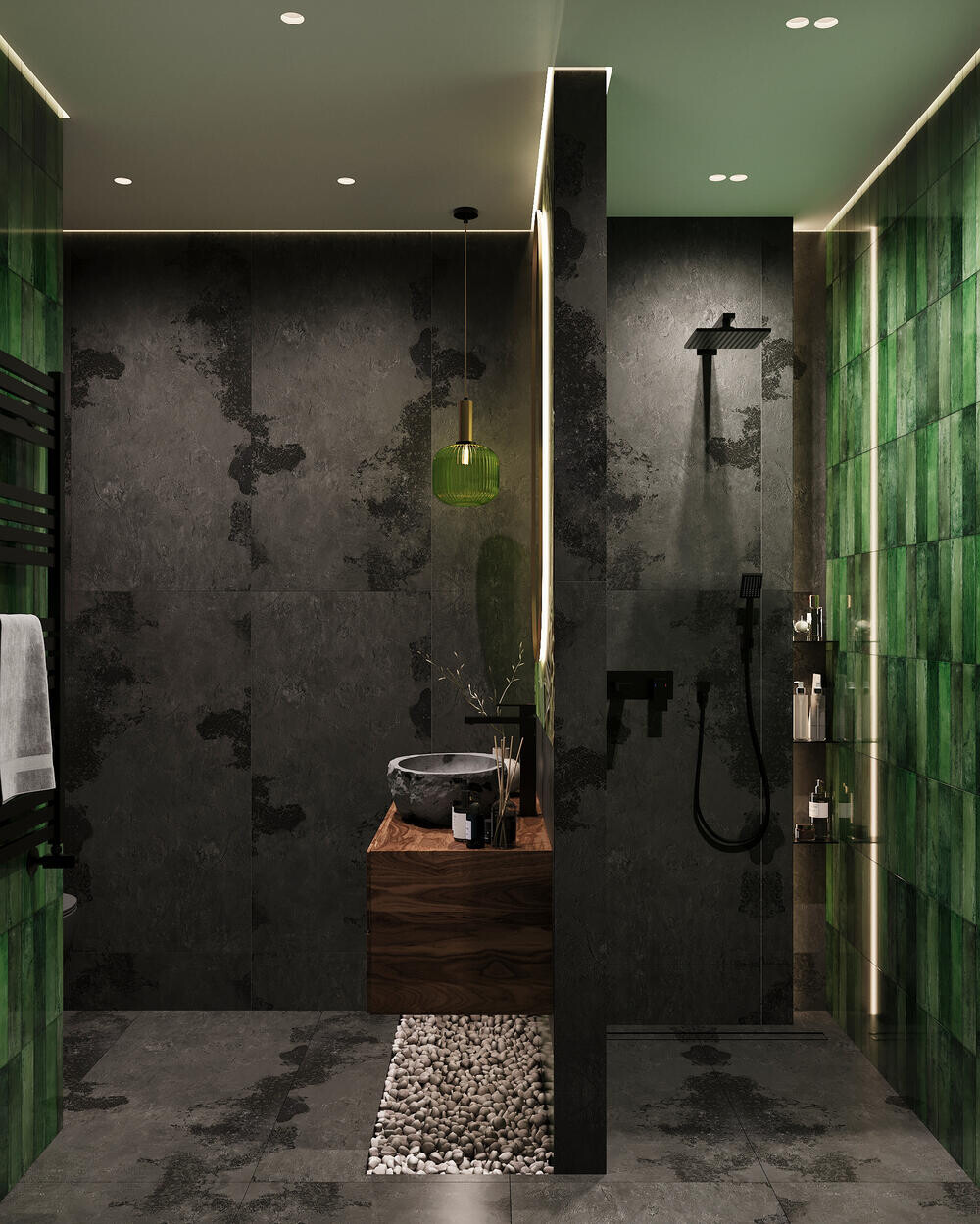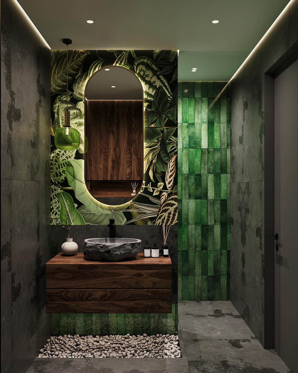 В душевой сделали контрастную подачу: тёмная плитка под бетон сочетается с зелёными акцентами на стенах. Центральный элемент — тумба из дерева с каменной раковиной и овальным зеркалом, под которым использована декоративная засыпка из гальки. Душевая зона оформлена стеклянной перегородкой и чёрной сантехникой, что чётко отделяет её визуально.