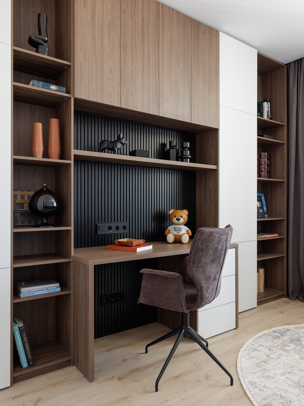 Контраст светлого и темного дерева в отделке стеллажей подчеркивает строгую, но комфортную эстетику домашнего офиса. Здесь также предусмотрели место для большой библиотеки, так как заказчики любят чтение.