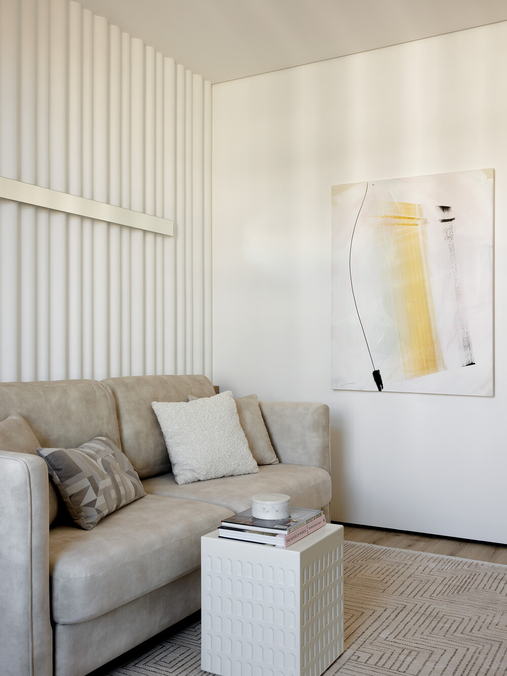Мы добавили строгие линии в деталях, чтобы подчеркнуть современный характер этого пространства. За счет отсутствия лишнего декора поддерживать порядок здесь будет максимально просто.