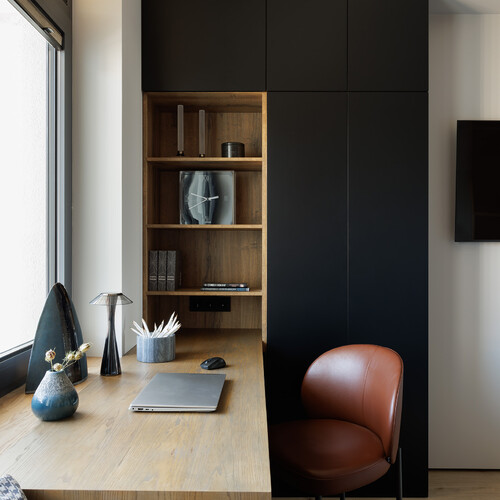 Для работы дома спроектировали вместительный шкаф, в который встроена широкая столешница. Рабочее место плавно переходит в зону отдыха у панорамного окна, создавая единую мебельную конструкцию. Окна в пол наполняют комнату естественным светом, а легкая мебель не загромождает проход.