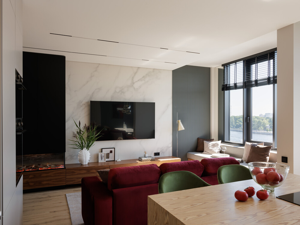 Кухонный гарнитур сделали минималистичным: фасады без ручек и встроенная техника не перегружают интерьер. Центром комнаты стал большой бордовый диван, который выступает главным цветовым пятном в квартире. У окна смонтировали подиум с мягкими подушками, где удобно отдыхать и смотреть на город.