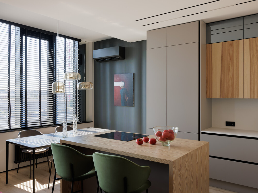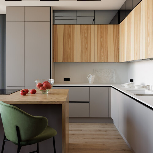 Основа интерьера — современный стиль, базовая палитра состоит из серых и белых оттенков, которые дополнены теплыми деревянными текстурами. Яркие акценты бордового и зеленого, делают пространство живым и индивидуальным.