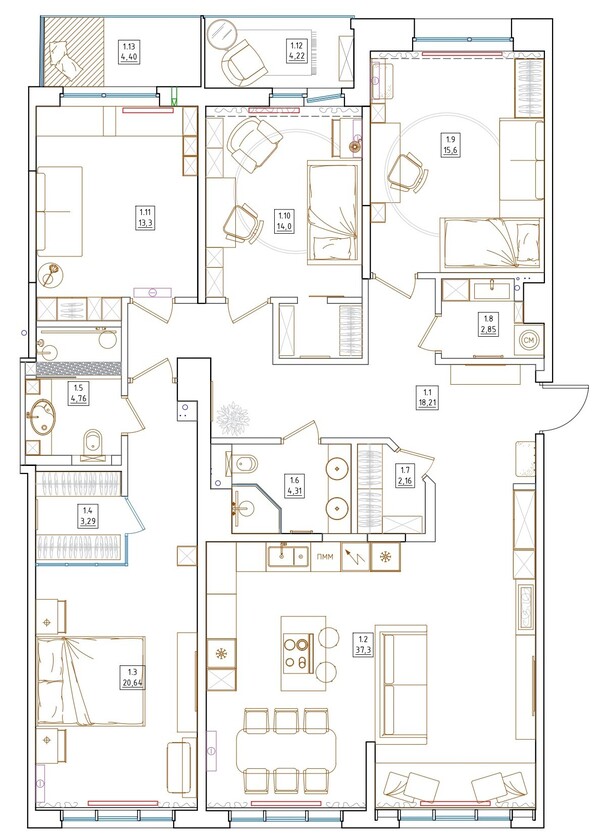Дизайн интерьера квартиры в ЖК «TESORO by Akvilon» в Санкт-Петербурге в современном стиле — 145 м²