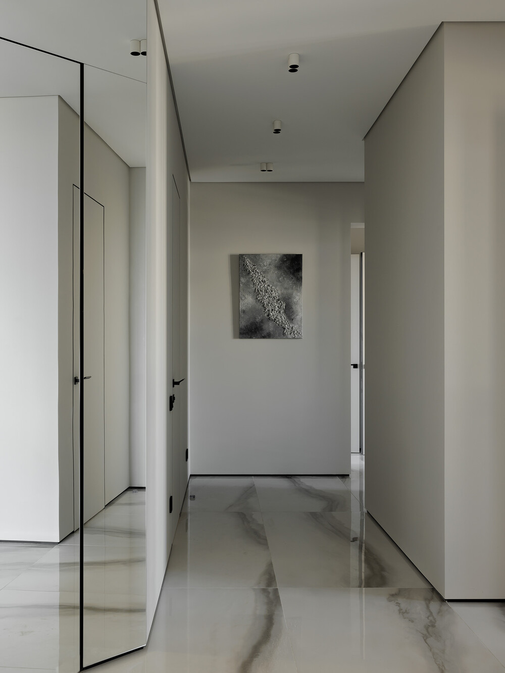В холле сложной многоугольной формы установили огромное зеркало от пола до потолка, повернутое под углом 45 градусов. Этот прием визуально расширяет коридор, а за самим зеркалом скрывается полноценная гардеробная. Для отделки стен использовали керамогранит под светлый мрамор — это практичное решение защищает поверхности от повреждений.