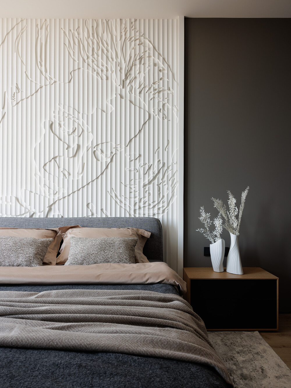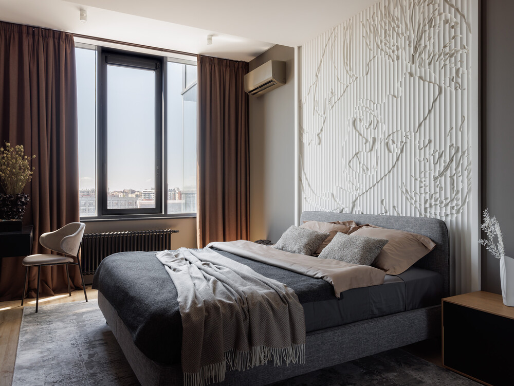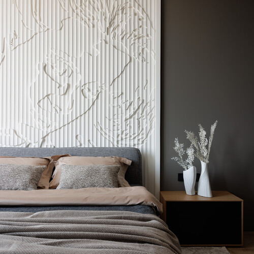 Интерьер главной спальни получился камерным и спокойным за счет использования теплых темных тонов. В изголовье кровати разместили барельеф с абстрактным рисунком, который добавляет стене рельефности.