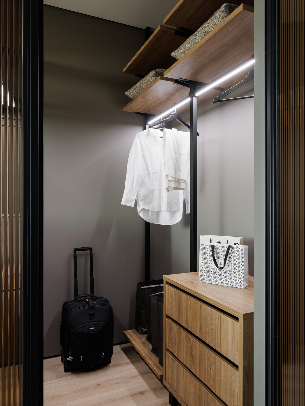 Зону хранения отделили угловой перегородкой из рифленого тонированного стекла. Такая конструкция пропускает свет, но мягко рассеивает его, скрывая содержимое полок. Плотные шторы помогают создать обстановку для полноценного отдыха в любое время дня.