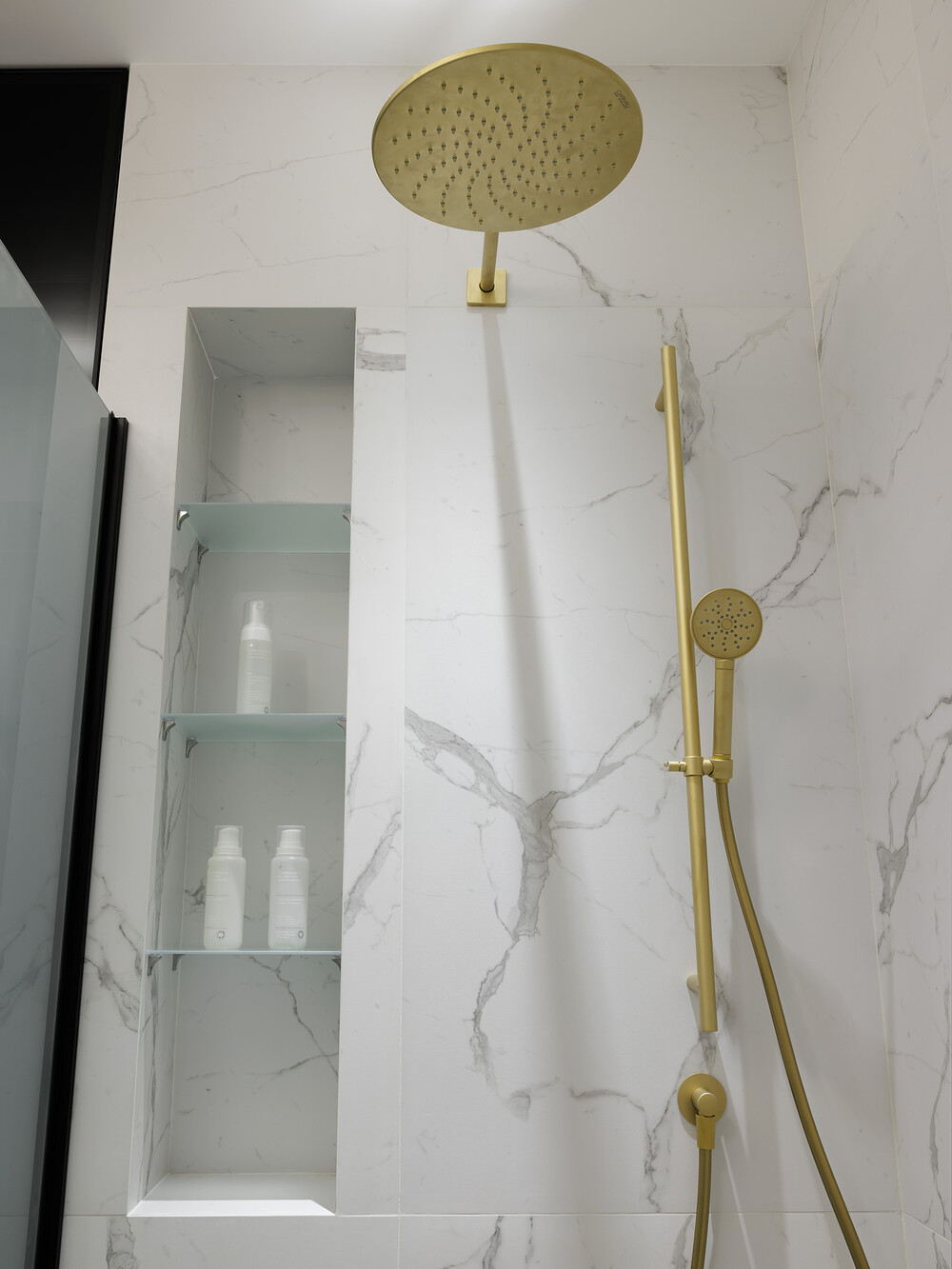 Вместительные шкафы спрятали за фасадами, поэтому банные принадлежности не создают визуального шума. Просторная душевая зона выполнена в минималистичном ключе без лишних бортиков и стыков.
