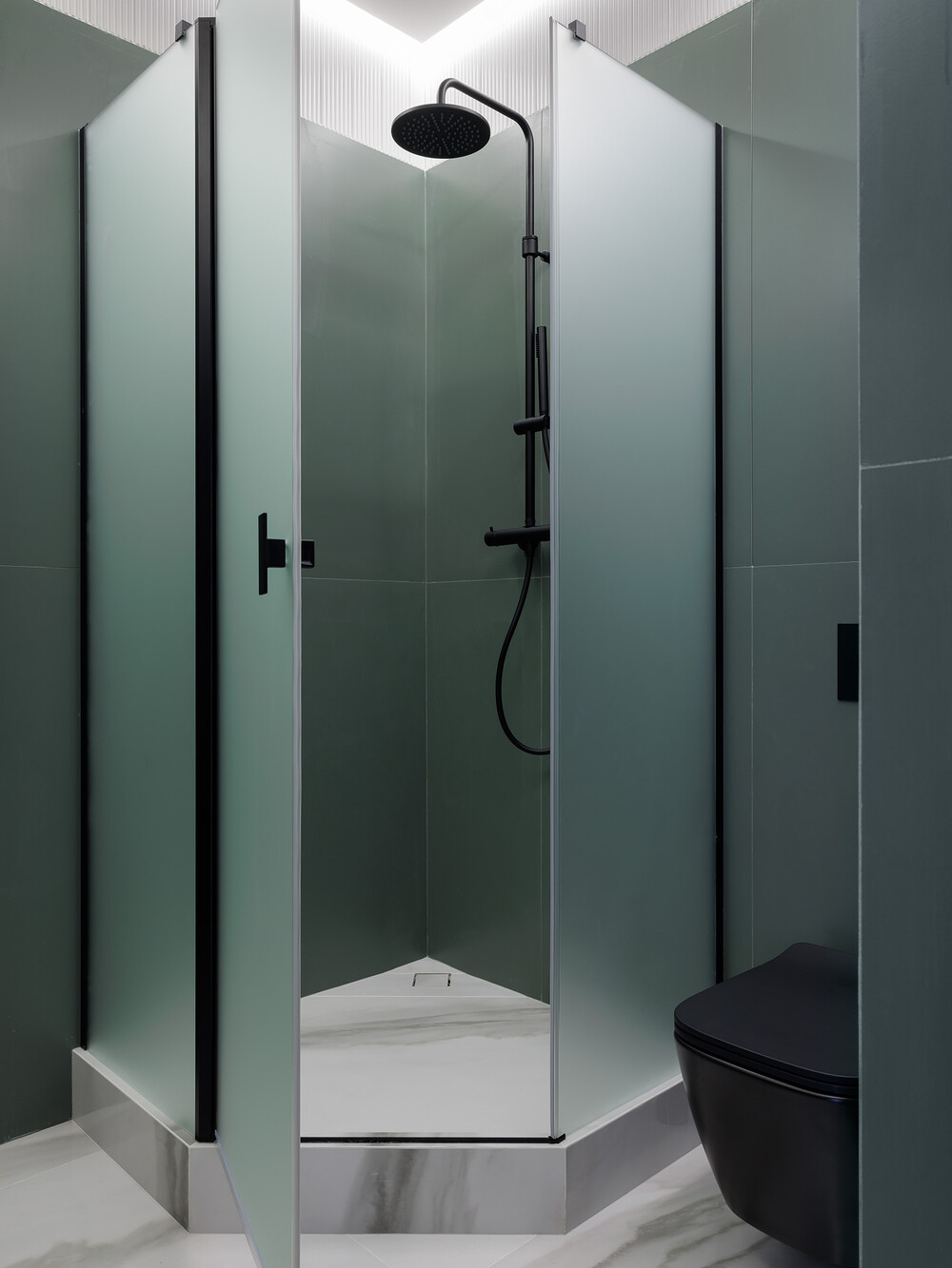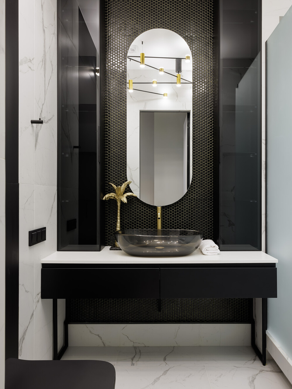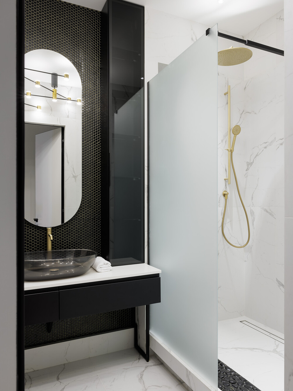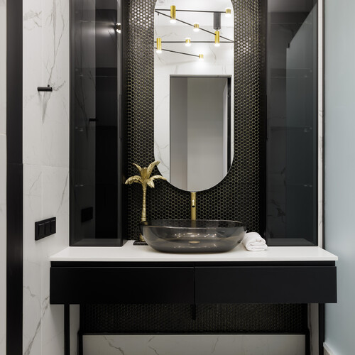 Ванную комнату при спальне оформили на контрасте черного и белого цветов. Лаконичная душевая кабина и графичная сантехника соответствуют актуальным трендам в отделке. Светлый керамогранит визуально расширяет помещение и делает его более легким.