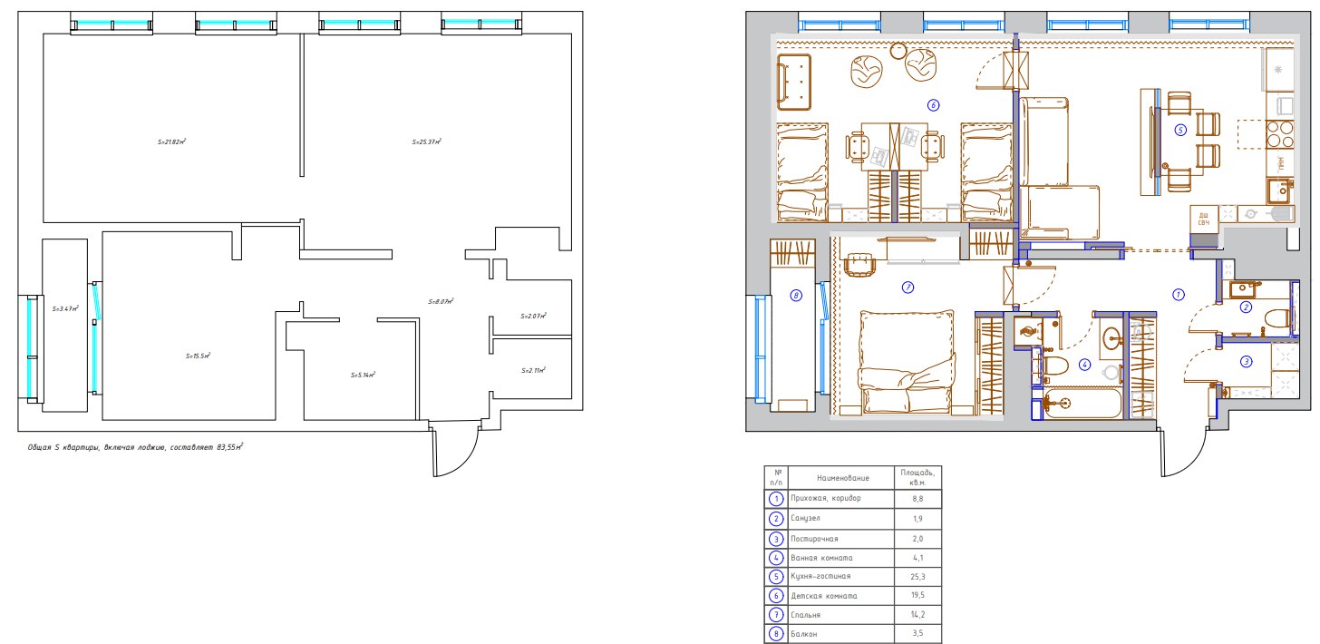 Для этого проекта мы подготовили план с серьезным изменением перегородок. Площадь ванной стала больше за счет части коридора, что позволило вписать глубокую нишу под технику. Детскую комнату расширили, забрав часть метров у гостиной — теперь там помещаются две полноценные спальные зоны. Кухню и гостиную мы оставили в едином контуре, но внедрили четкие границы для каждой функциональной точки.