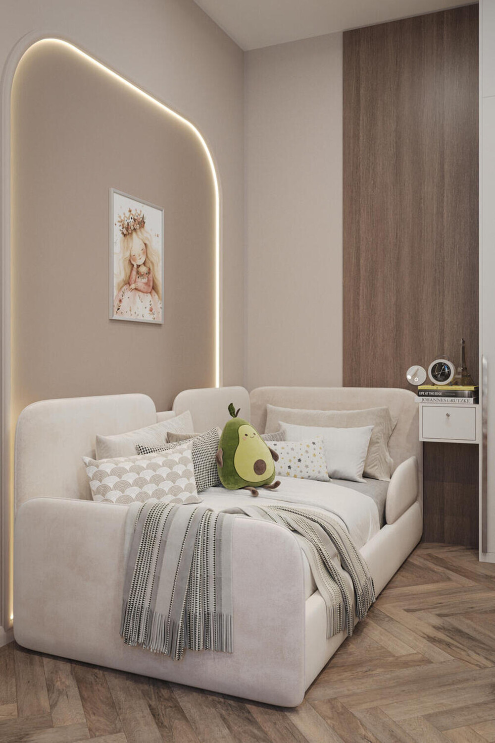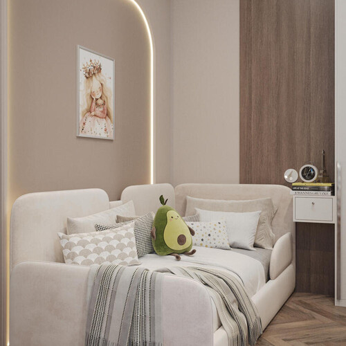 Кровати спрятали в ниши с мягкой отделкой стен и контурной подсветкой. Мы предусмотрели несколько вариантов освещения: от яркого потолочного для игр и учебы до мягких светильников у подушек. Нейтральный цвет стен здесь дополняют яркие игровые элементы и декор.