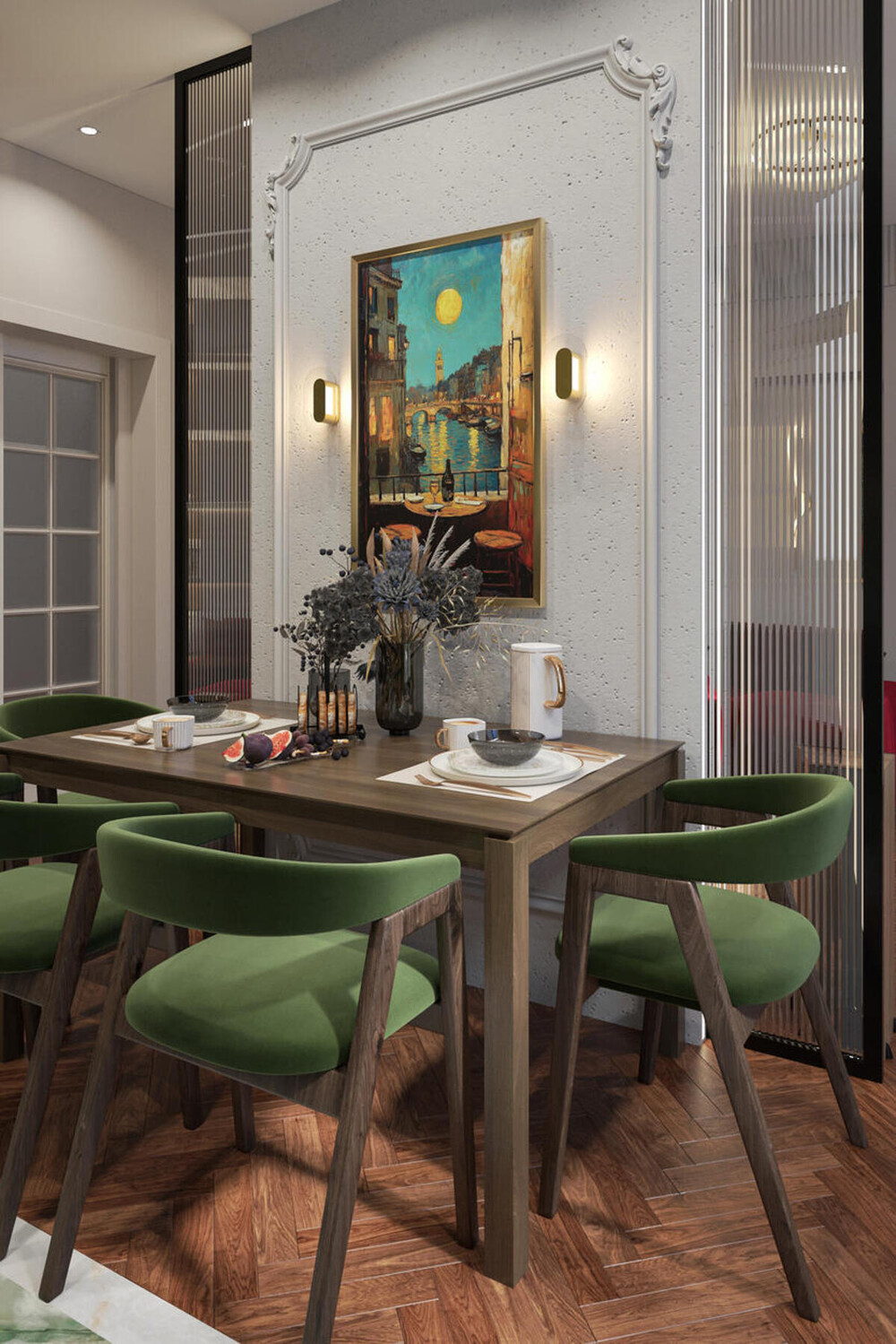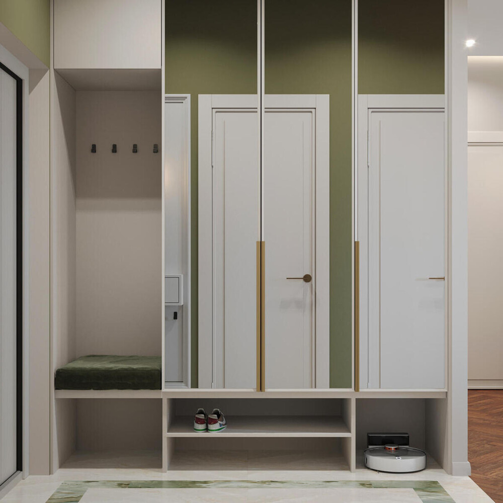 Интерьер выполнен в современном стиле с классическими французскими элементами. Цветовая база построена на молочно-белых и теплых серых оттенках, которые делают пространство светлее и визуально просторнее. Зеленые и терракотовые акценты добавлены через мебель, панели и текстиль, чтобы интерьер сохранял спокойствие и цельность.