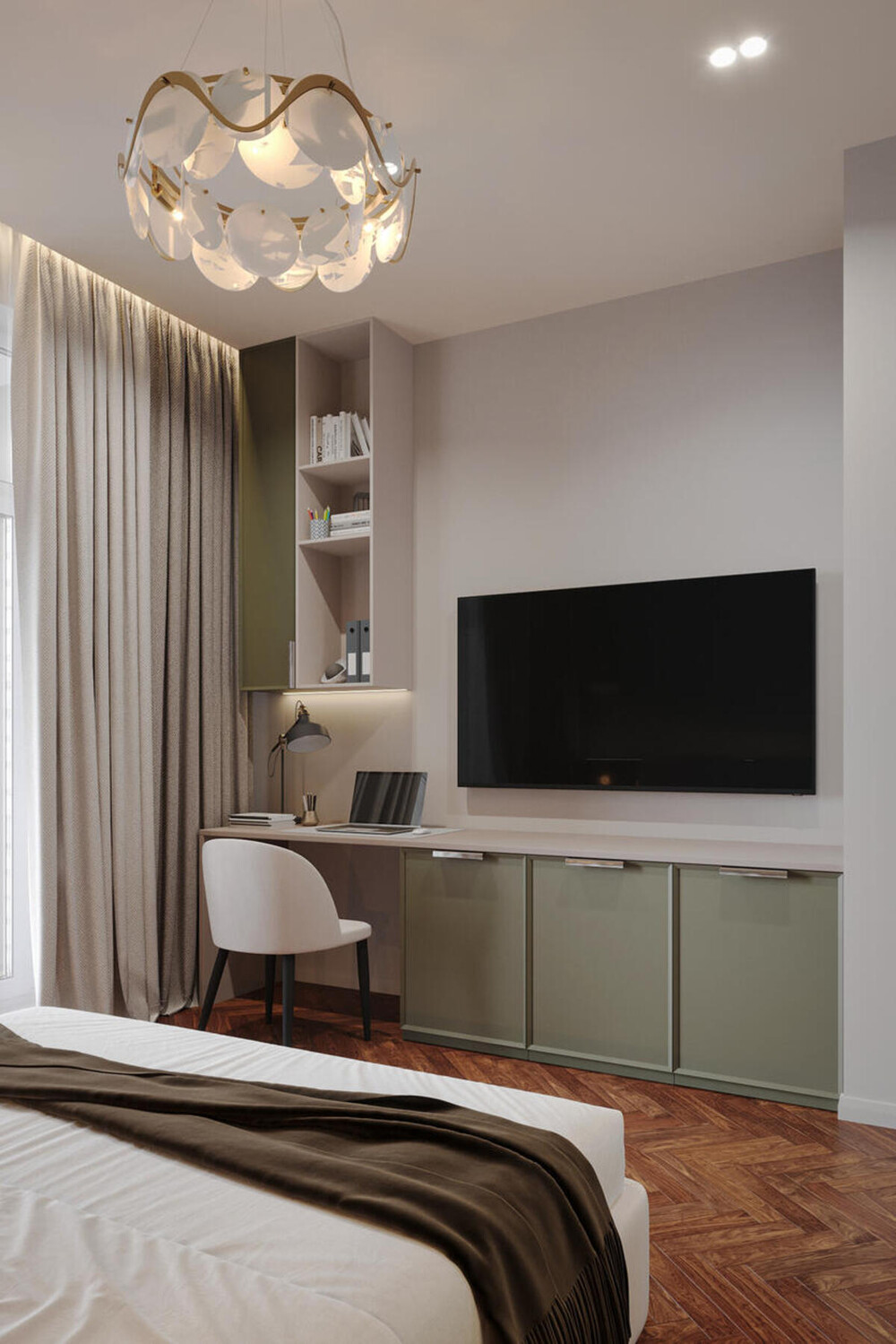 В этой комнате основной акцент сделали на стену в изголовье кровати, украсив её барельефом с птицами. По бокам от кровати с мягкой обивкой закрепили симметричные бра для чтения. Напротив расположили длинную консоль оливкового цвета, которая служит одновременно рабочим столом и тумбой под ТВ.
