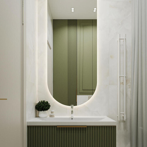 Шкафы и тумбу под раковину заказали с вертикальной фрезеровкой фасадов в пыльно-зеленом цвете. Рифленые поверхности визуально поднимают потолок и скрывают места для хранения бытовых мелочей.