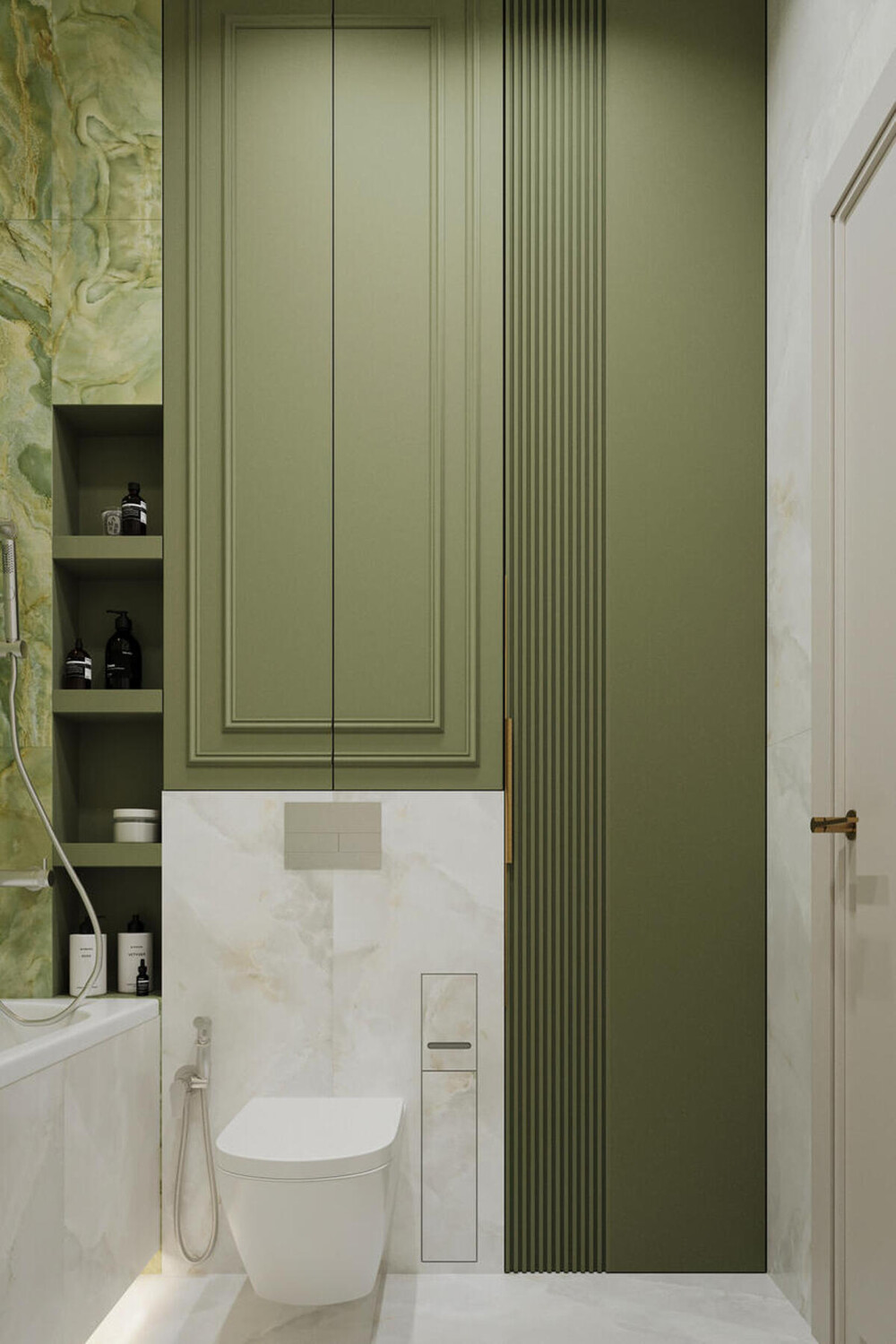 Зеленый оникс в мокрых зонах — создает яркую вертикаль и связывает дизайн ванной с общей палитрой квартиры.