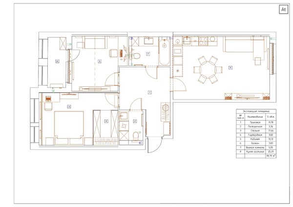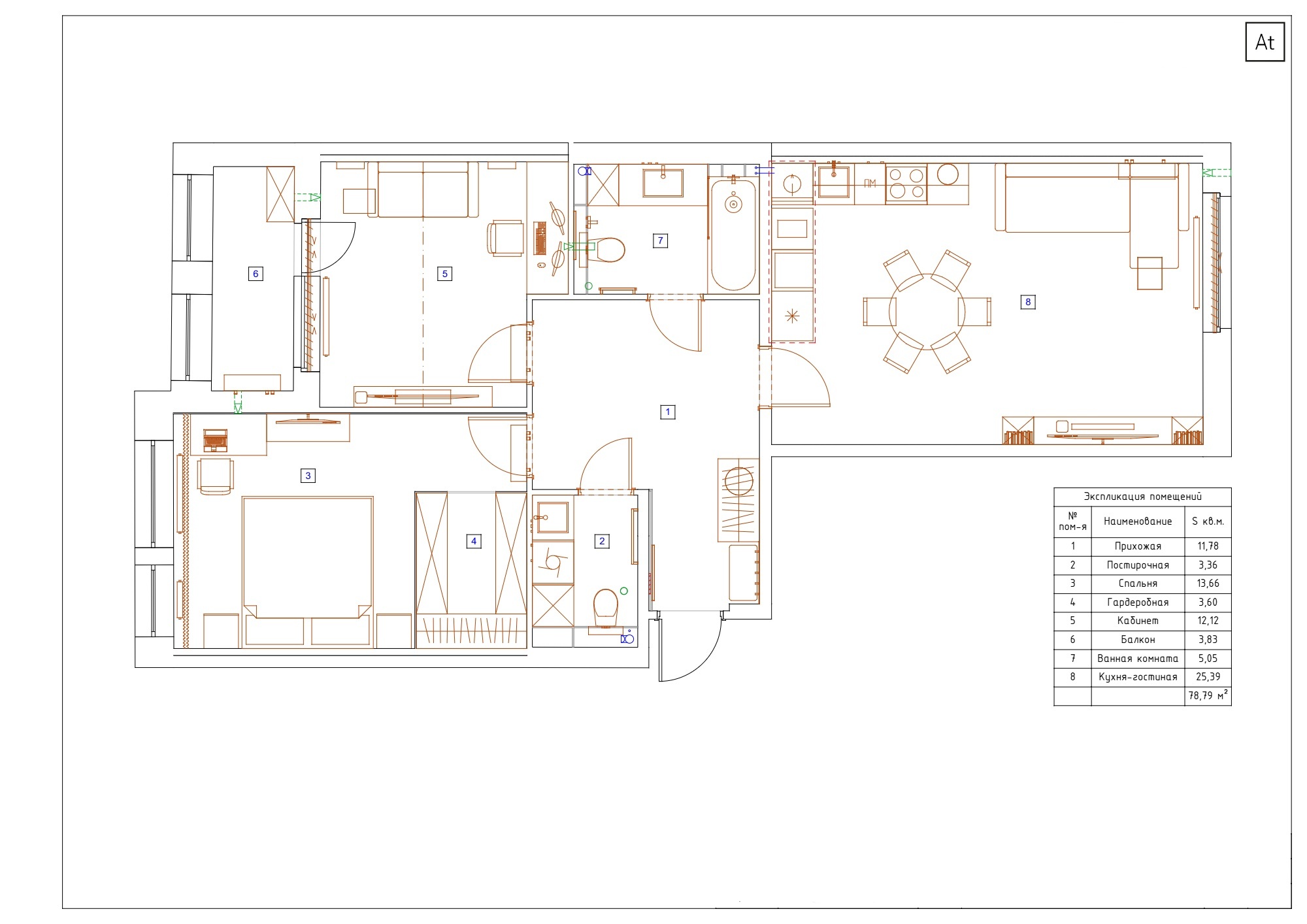Мы изменили исходное пространство, чтобы сделать его более логичным. Площадь санузла увеличили — это позволило выделить место под полноценную постирочную с техникой и хозяйственным шкафом. В спальне возвели стеклянный бокс для одежды, который визуально не съедает метры. Кабинет стал больше: теперь здесь свободно помещается широкий стол и стеллажи. Кухню объединили с гостиной, выстроив технику в одну линию для сохранения минималистичного вида.