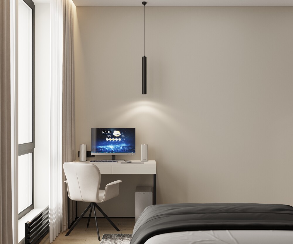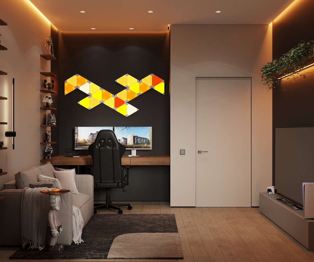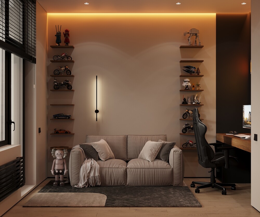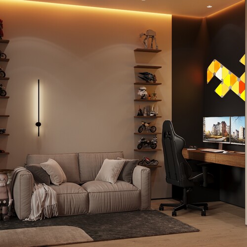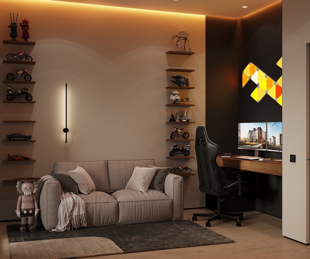 В этой комнате мы сфокусировались на увлечениях владельцев и комфортной работе. Рабочую зону выделили темным цветом и дополнили настенными RGB-панелями, меняющими оттенок свечения. Стол из массива рассчитан на два больших монитора, а рядом встали легкие полки для демонстрации коллекции фигурок.