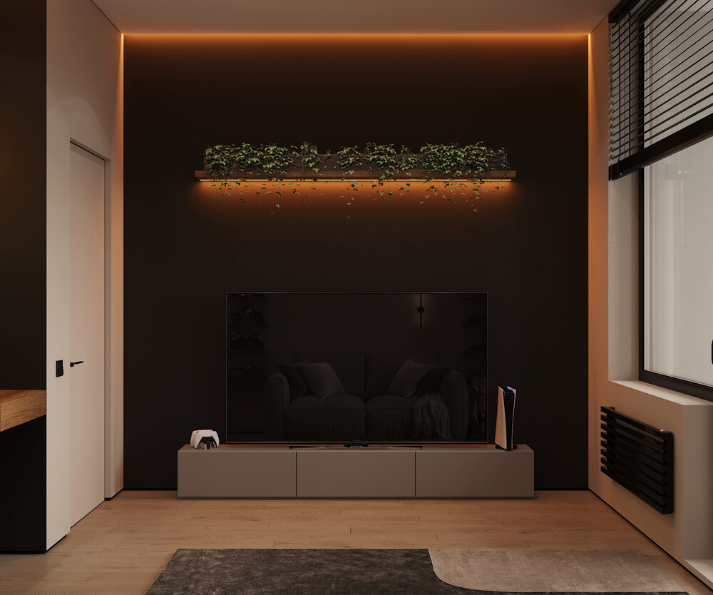Трековая система на потолке дает равномерный свет, а нижняя подсветка вдоль пола создает эффект парящих стен. Яркая картина на стене добавляет пространству динамики и цвета.